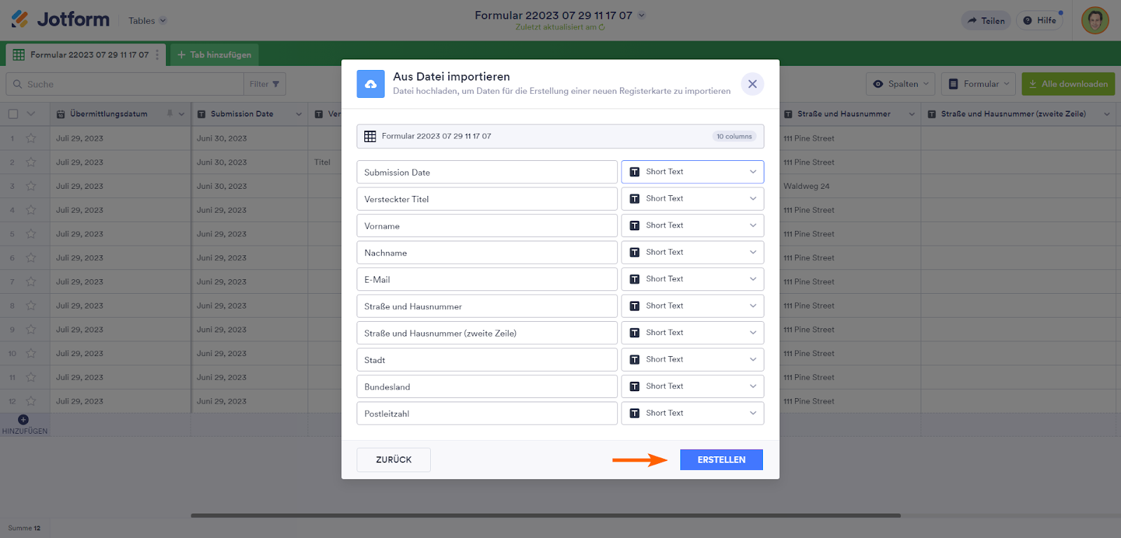 - Spaltentypen festlegen. Wählen Sie anschließend Erstellen.