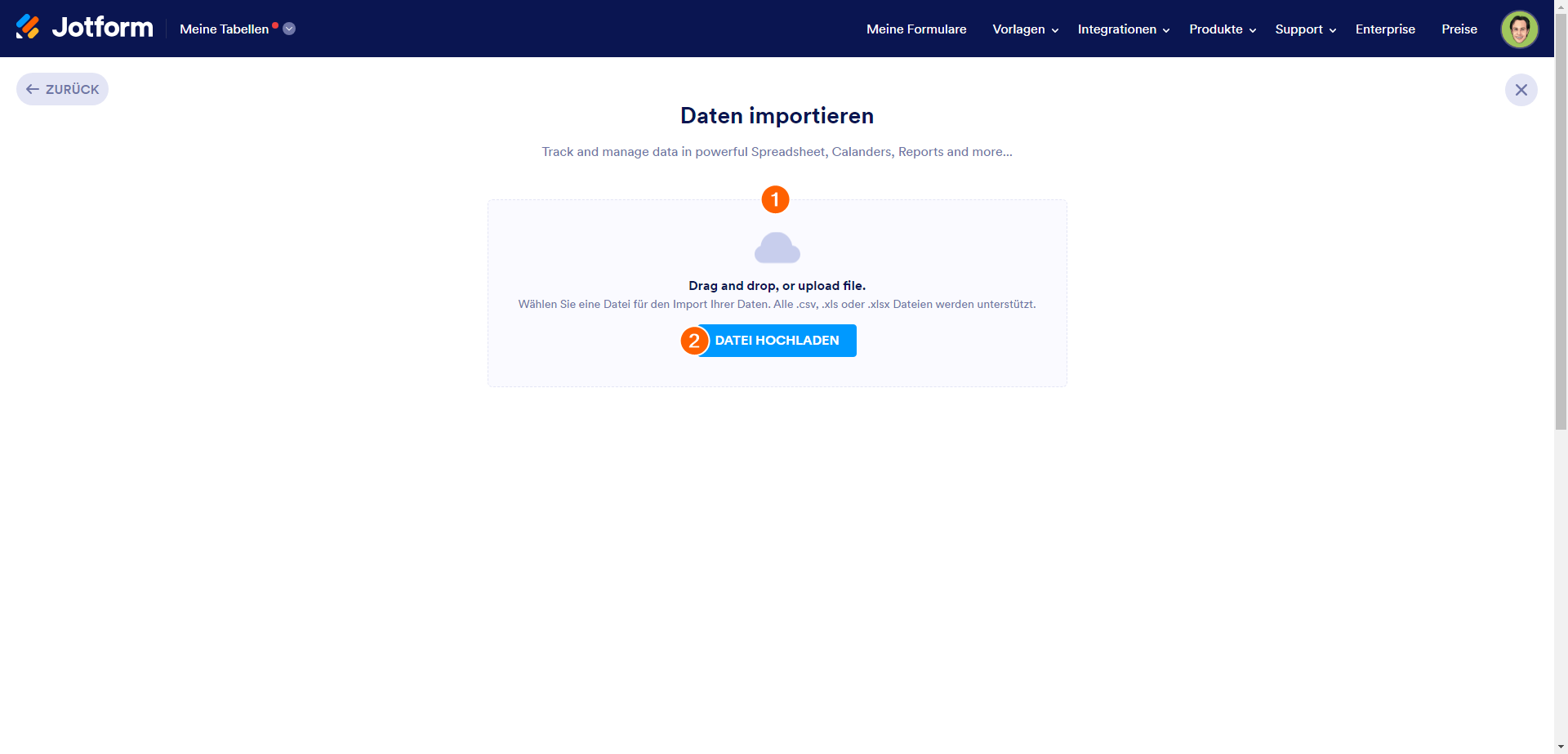 - Wählen Sie Daten importieren und laden Sie anschließend Ihre Excel- oder CSV-Datei hoch.