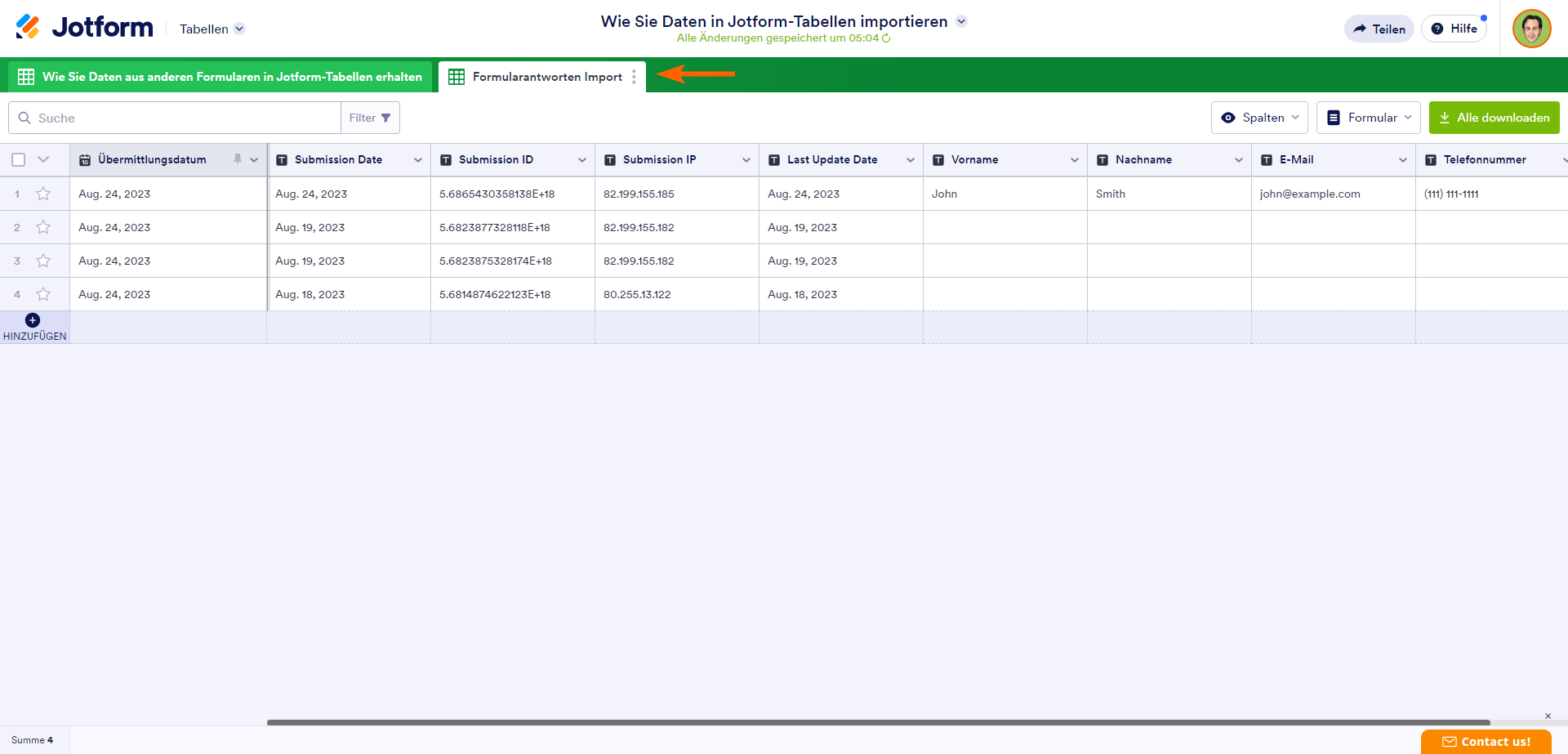 Sie können Ihre importierten Daten jetzt in Jotform Tabellen verwalten.