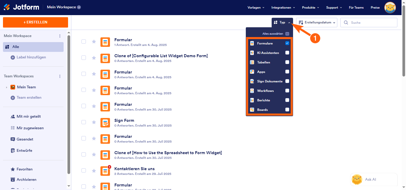 - Klicken Sie auf der Mein Arbeitsbereich oben auf Typ und deaktivieren Sie im sich öffnenden Dropdown-Menü die Kontrollkästchen neben allen Assets außer Formularen, sodass nur diese auf der Seite angezeigt werden.
