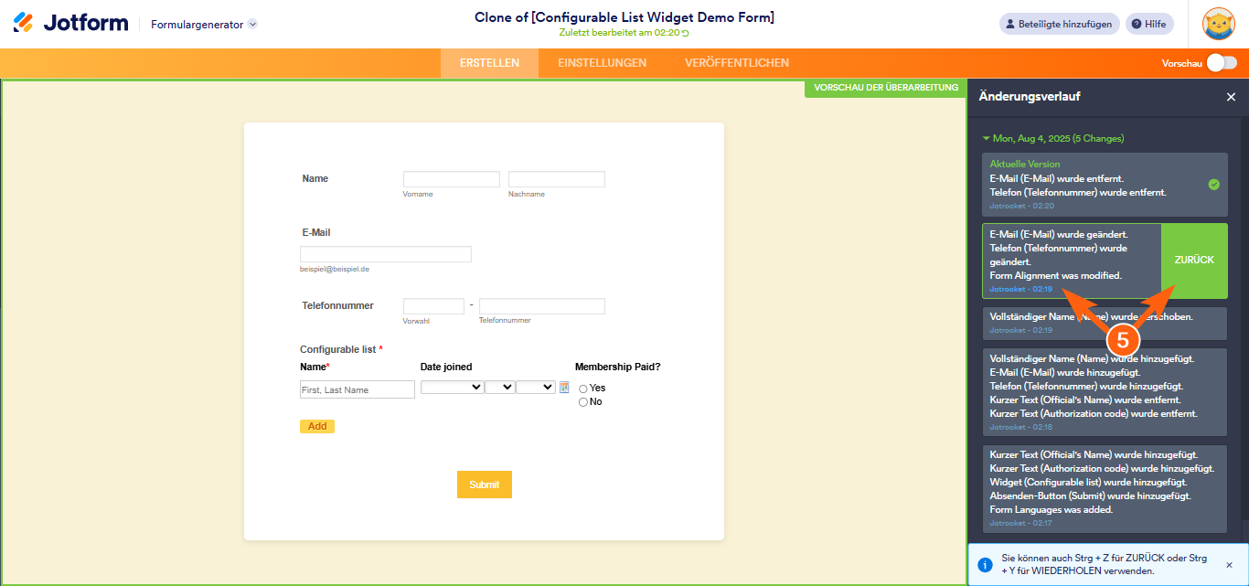 Mit der Revisionsverlauf Funktion von Jotform können Sie Änderungen an Ihrem Formular ganz einfach überprüfen und wiederherstellen. Jede Bearbeitung wird automatisch protokolliert, sodass Sie frühere Versionen einsehen und mit nur wenigen Klicks wiederherstellen können. Ob Sie einen Fehler rückgängig machen, einen Bedingungskonflikt beheben oder einfach nur Aktualisierungen überprüfen möchten – der Revisionsverlauf hilft Ihnen dabei, sicher zu bearbeiten und Ihre Formulare Ihren Wünschen entsprechend zu gestalten.