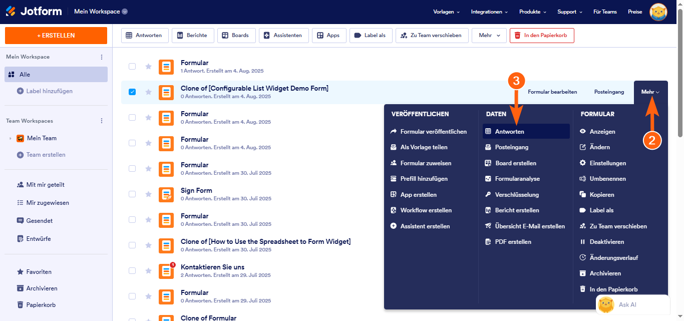 - Bewegen Sie nun den Mauszeiger über das zu verwaltende Formular und klicken Sie rechts auf der Seite auf Mehr.
