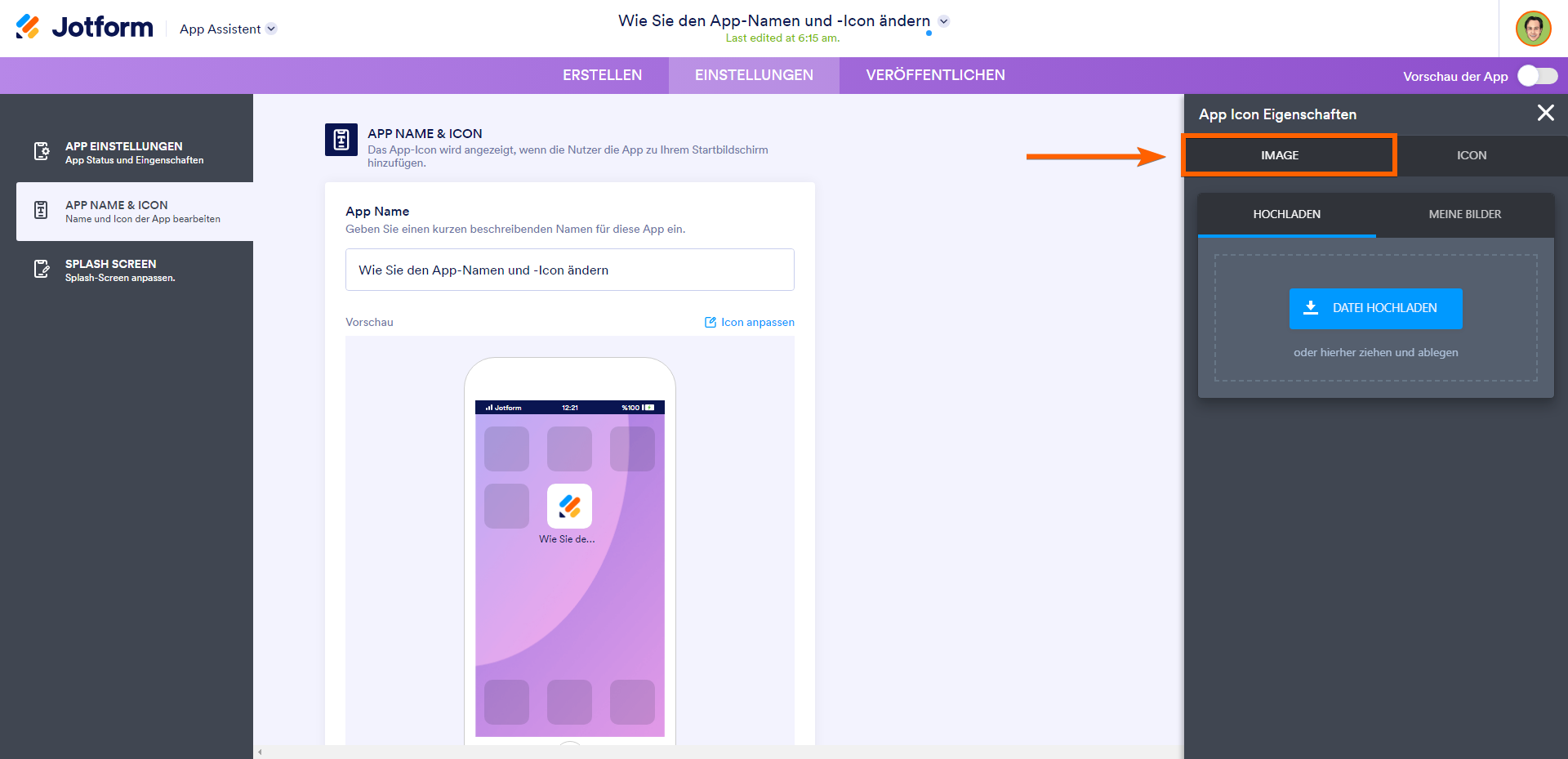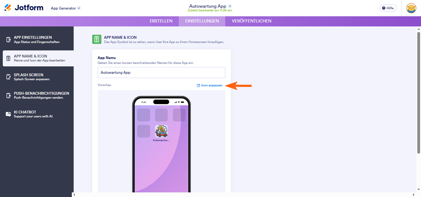 - Wählen Sie das Symbol Ihrer App im Eigenschaftenfenster rechts aus und passen Sie es an.