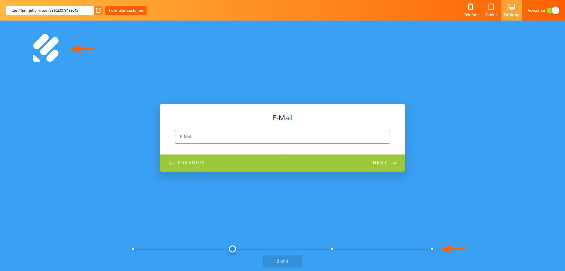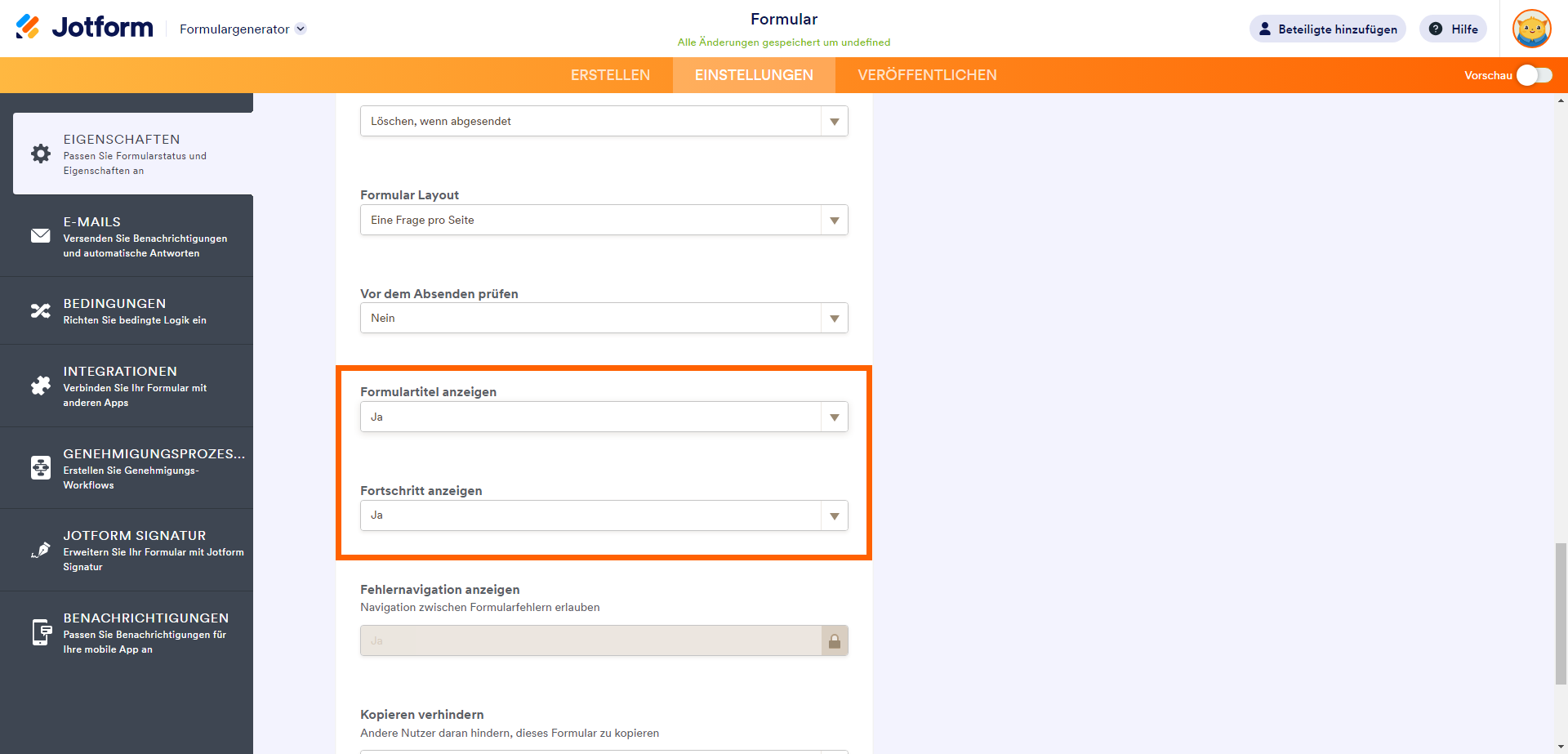 - Formularfortschritt anzeigen — Setzen Sie diese Option auf „Nein“, um den Fortschrittsbalken zu verbergen.