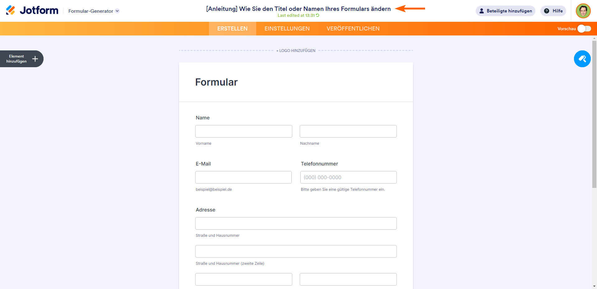 Neben Ihrer Seite Mein Arbeitsbereich können Sie den Namen Ihres Formulars auch im Formular Generator ändern, während Sie es erstellen oder bearbeiten. So geht’s: