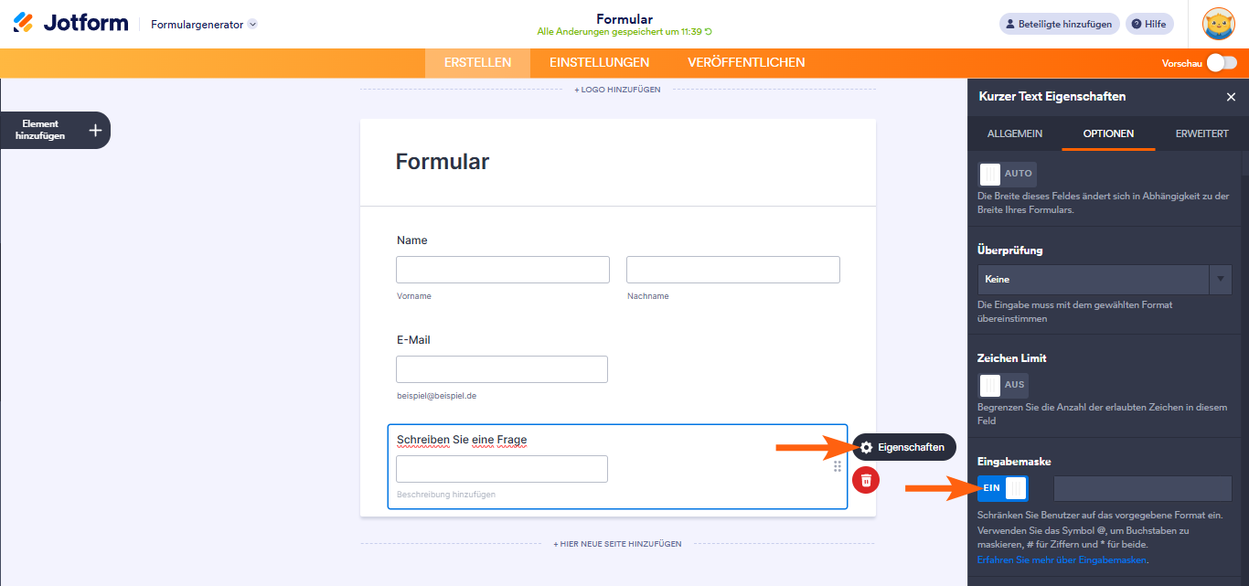 Wenn Sie das Element Kurztext oder Telefon bereits hinzugefügt haben, können Sie die Eingabemaske wie folgt aktivieren: