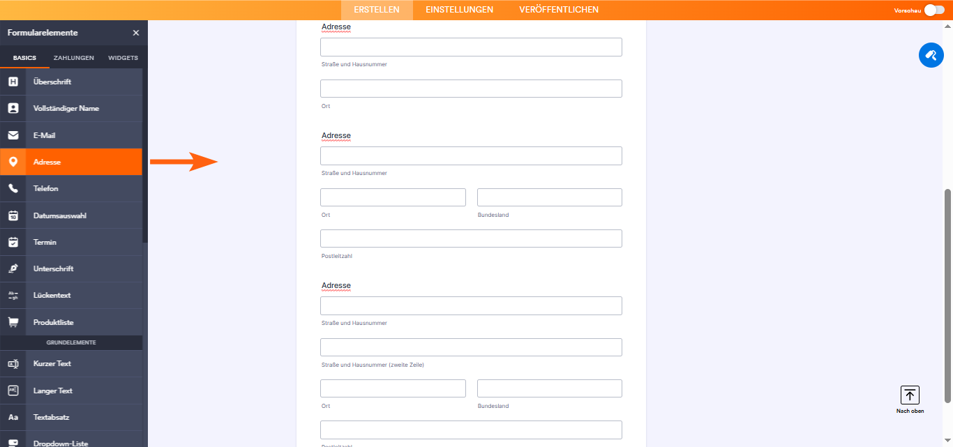 - Fügen Sie Ihrem Formular für jeden Adresstyp ein Einzelauswahl-Element als Adressauswahl und drei Adresselemente hinzu.