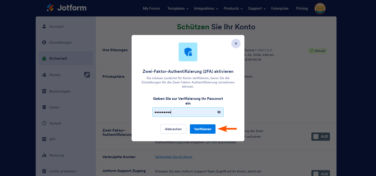 Mit Jotform können Sie die Sicherheit Ihres Enterprise-Kontos ganz einfach erhöhen, indem Sie die Zwei-Faktoren-Authentifizierung (2FA) aktivieren. Anstatt sich nur auf Ihr Passwort zu verlassen, fügt 2FA einen zweiten Schritt zum Anmeldeprozess hinzu – in der Regel einen zeitbasierten Code von einer Authentifizierungs-App. Diese zusätzliche Sicherheitsebene hilft, die Daten Ihrer Organisation zu schützen, selbst wenn jemand Ihr Passwort in die Hände bekommt.