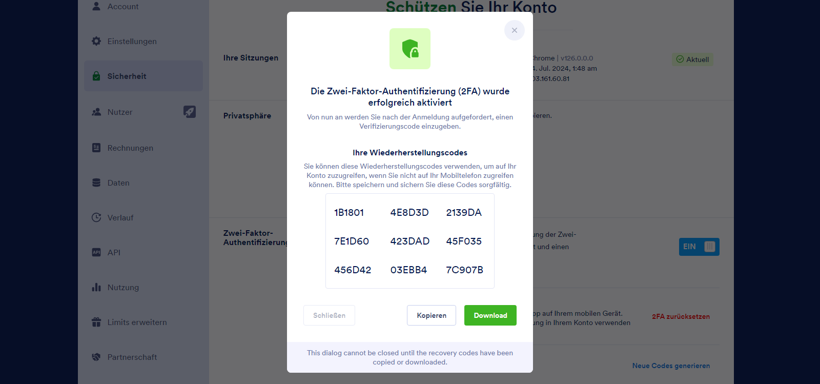 Bevor Sie das Fenster schließen, kopieren oder laden Sie Ihre Wiederherstellungscodes herunter. Sie benötigen diese, falls Sie den Zugriff auf Ihre Authentifizierungs-App verlieren. Bewahren Sie sie daher an einem sicheren und leicht zugänglichen Ort auf.