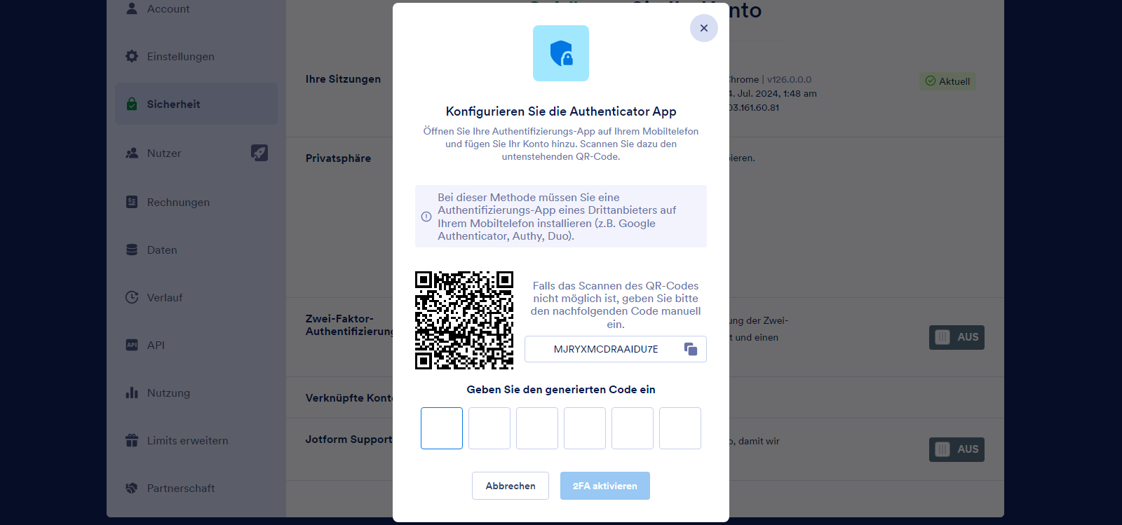 - Scannen Sie nun im Fenster Authenticator-App konfigurieren den QR-Code oder geben Sie den Einrichtungsschlüssel in Ihrer Authenticator-App ein. Geben Sie anschließend den generierten Code in die Felder darunter ein. Er wird automatisch akzeptiert. Sollte dies nicht der Fall sein oder Sie einen falschen Code eingegeben haben, korrigieren Sie ihn und klicken Sie auf 2FA aktivieren.