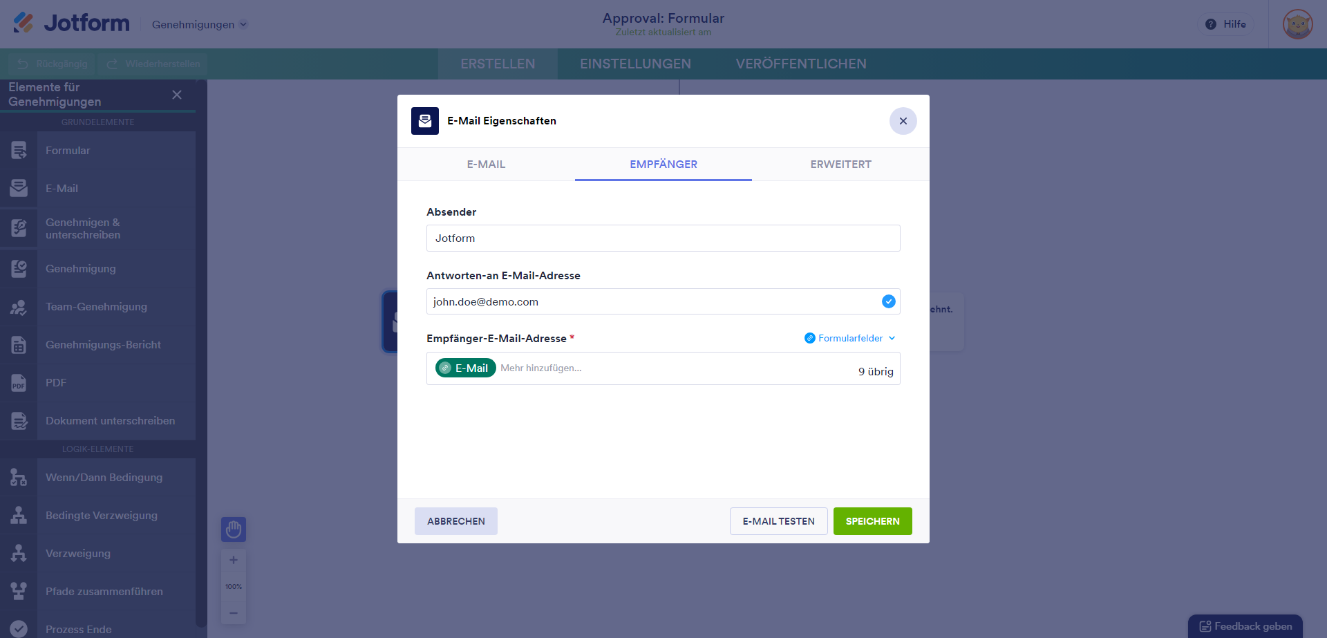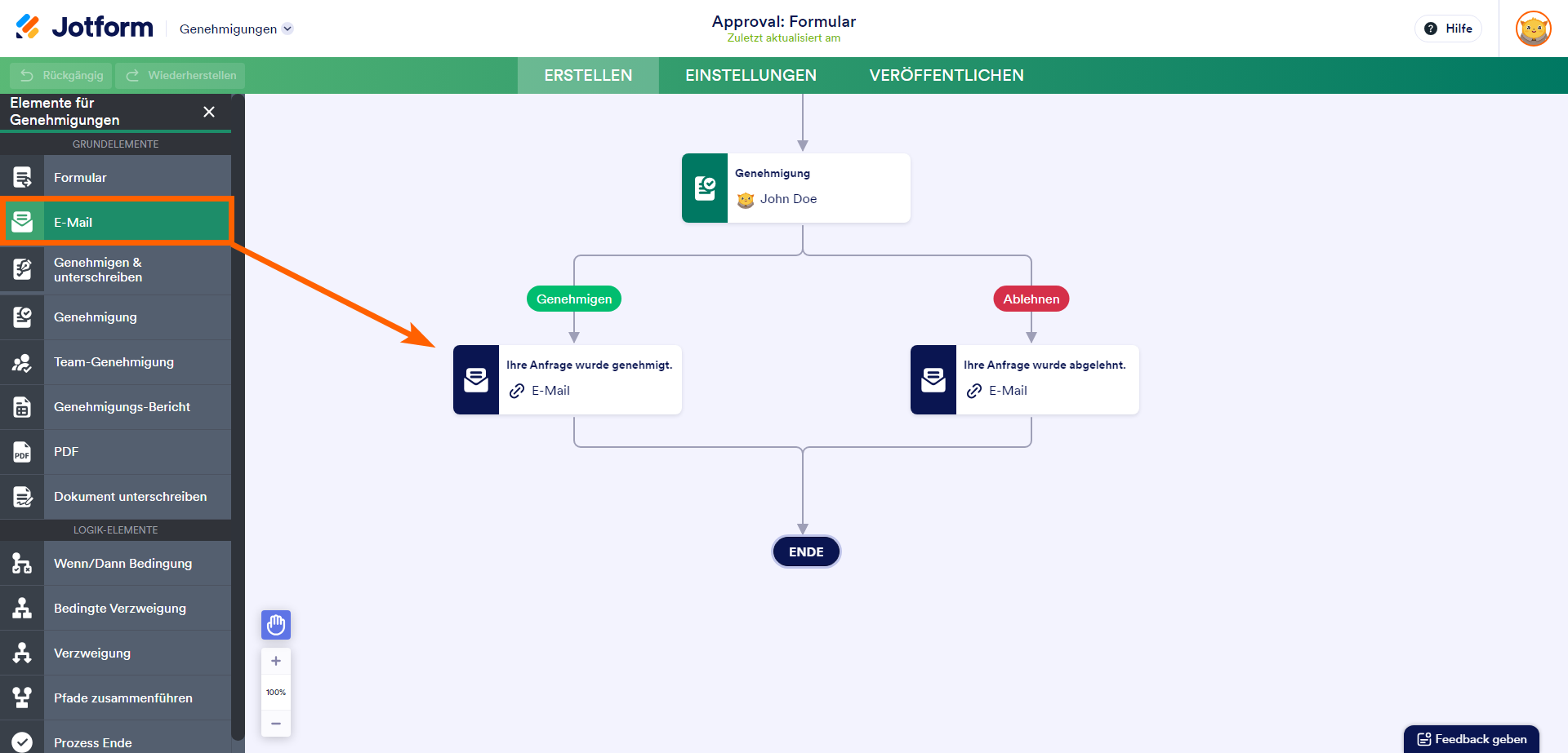 Wenn in Ihrem Formular ein E-Mail-Feld vorhanden ist, wird dem Workflow automatisch ein E-Mail-Element hinzugefügt.