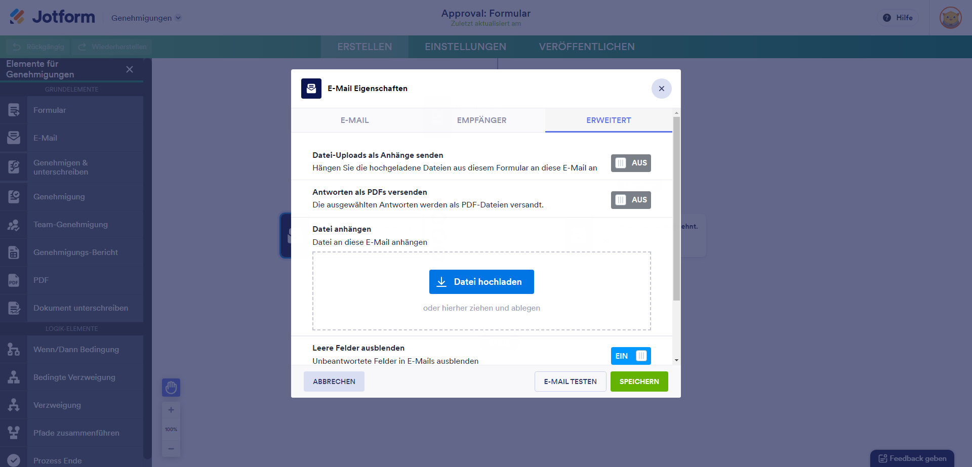 Auf der Registerkarte Erweitert können Sie Dateianhangsoptionen für die Workflow-E-Mail festlegen. Sie können außerdem leere Formularfelder im E-Mail-Inhalt automatisch ausblenden und Ihre bevorzugte Absender-E-Mail-Adresse festlegen.