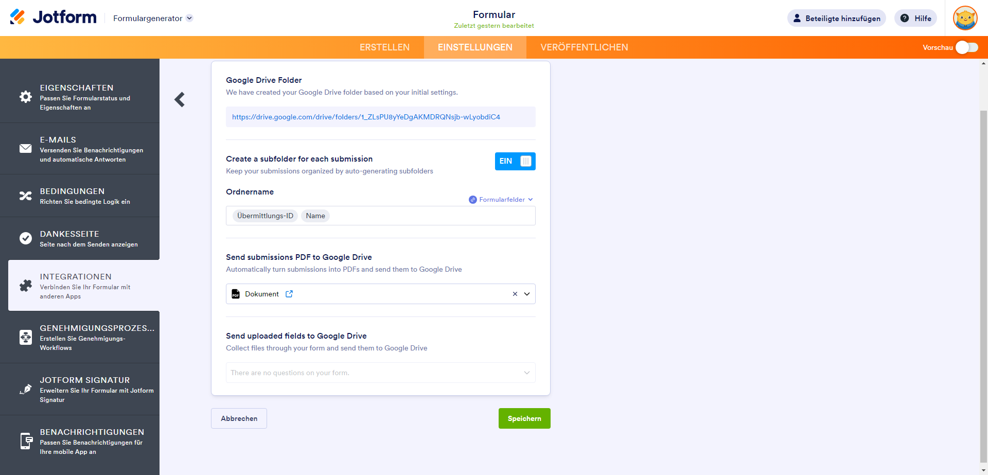 - Hochgeladene Dateien an Google Drive senden – Aktivieren Sie diese Option, um hochgeladene Dateien aus Ihrem Formular auf Google Drive zu übertragen.