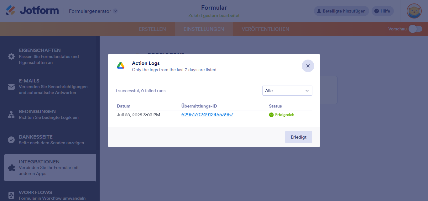 - Aktionsprotokolle anzeigen – In diesem Abschnitt werden Ihre erfolgreichen und fehlgeschlagenen Google-Drive-Ausführungen angezeigt. Dies ist hilfreich bei der Fehlerbehebung.