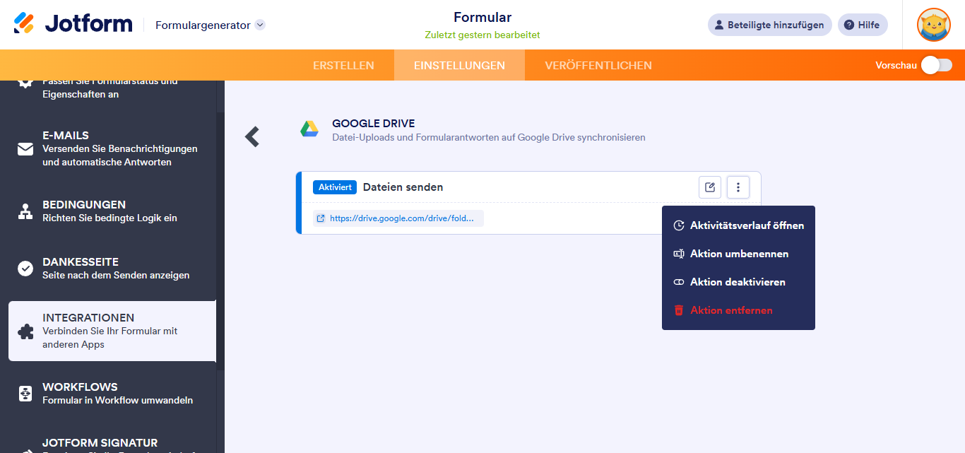 Nach dem Speichern der Integration sehen Sie den erstellten Link zu Ihrem Google-Drive-Ordner. Wenn Sie mit der Maus über die erstellte Aktion fahren, werden rechts die Optionen Aktion bearbeiten (Bleistiftsymbol) und Mehr (vertikales Symbol mit drei Punkten) angezeigt. Die Option Mehr enthält Folgendes: