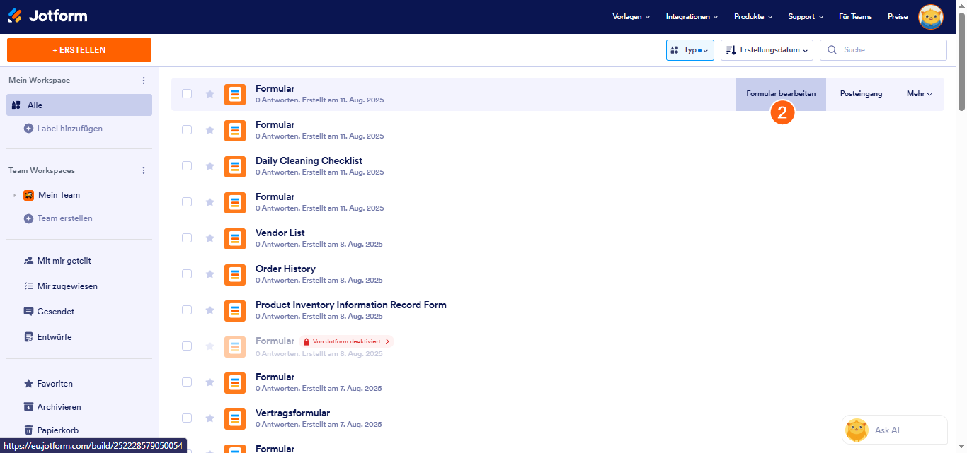- Bewegen Sie den Mauszeiger über das Formular, das Sie mit einem Passwort schützen möchten, und klicken Sie rechts auf der Seite auf Formular bearbeiten.