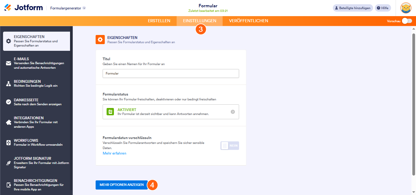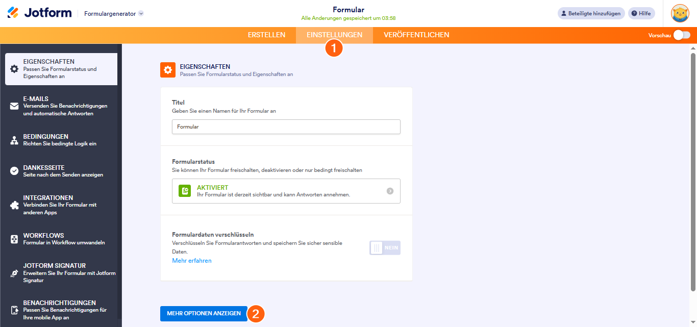 - Klicken Sie nun unter Formulareinstellungen unten auf Weitere Optionen anzeigen.