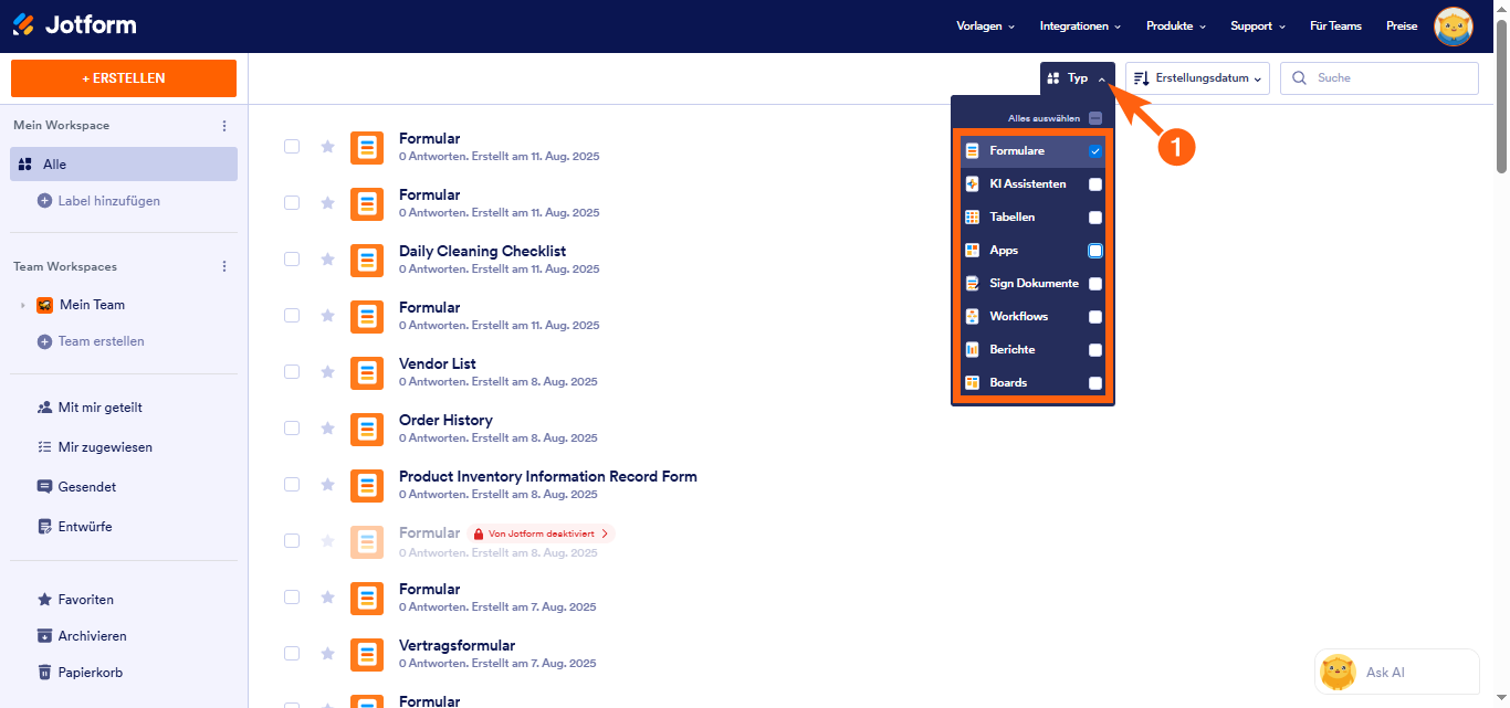 - Klicken Sie auf Ihrer Seite Mein Arbeitsbereich oben auf Typ und deaktivieren Sie im sich öffnenden Dropdown-Menü die Kontrollkästchen neben allen Assets außer Formularen, sodass nur diese auf der Seite angezeigt werden.