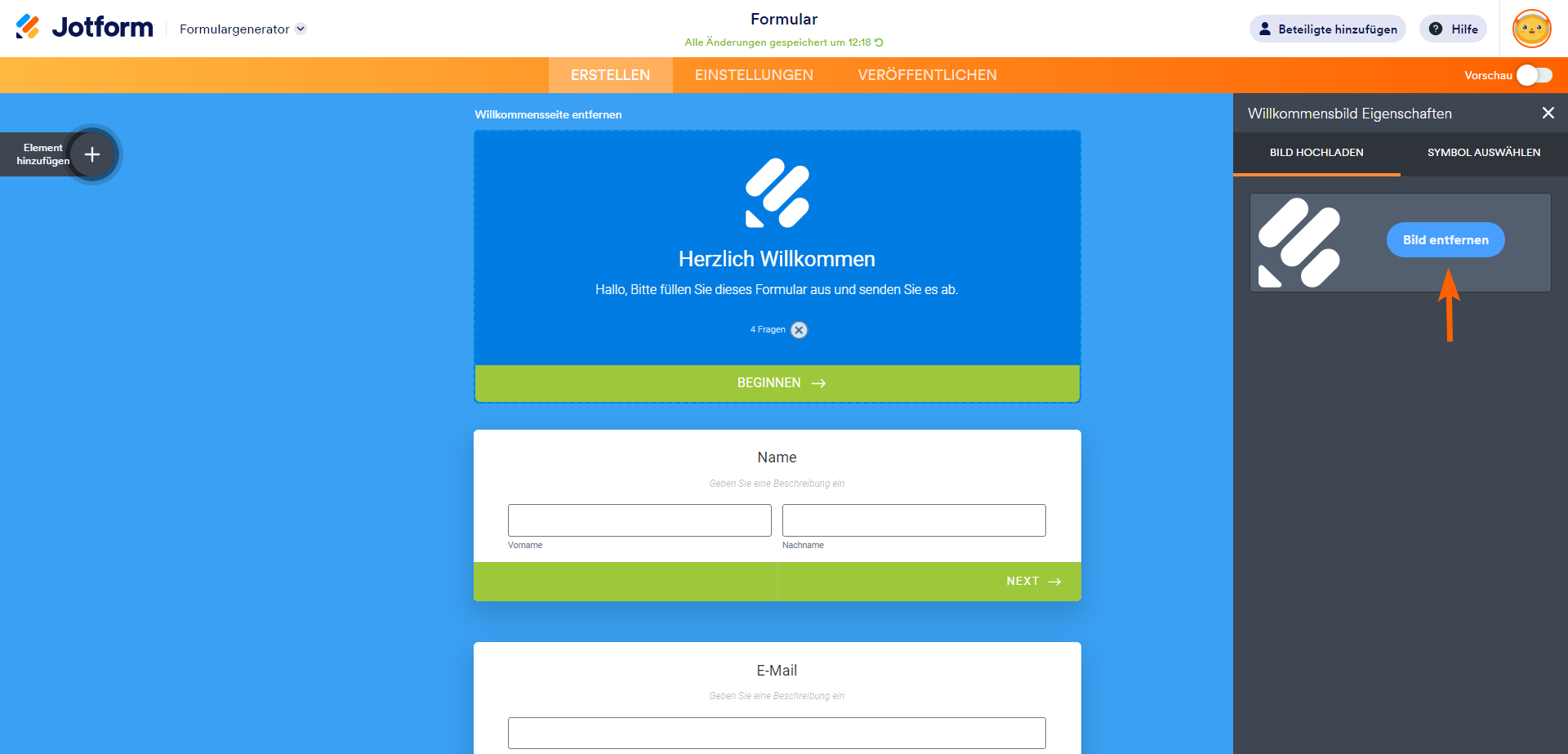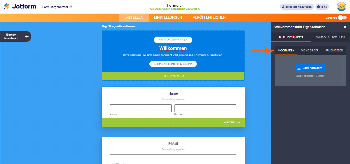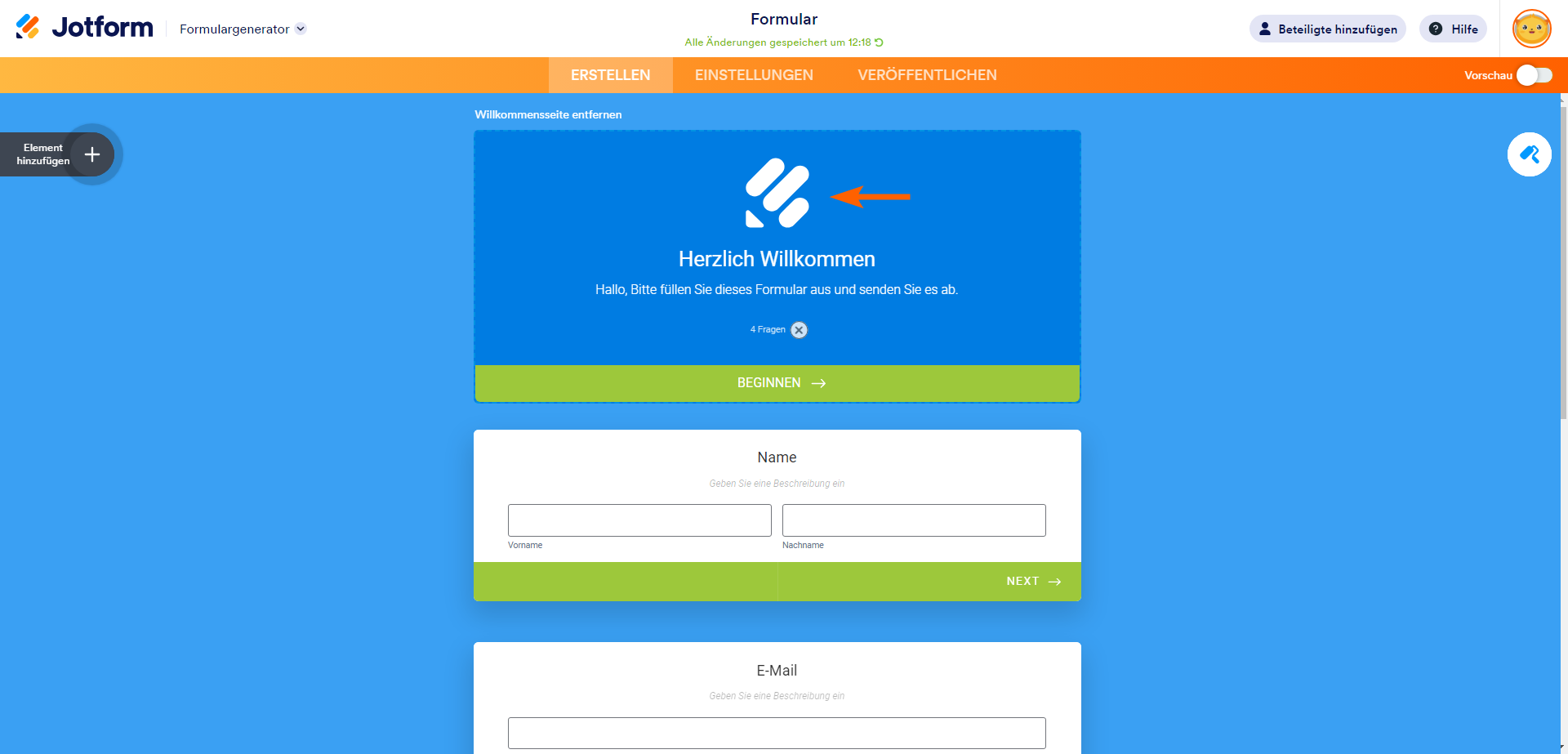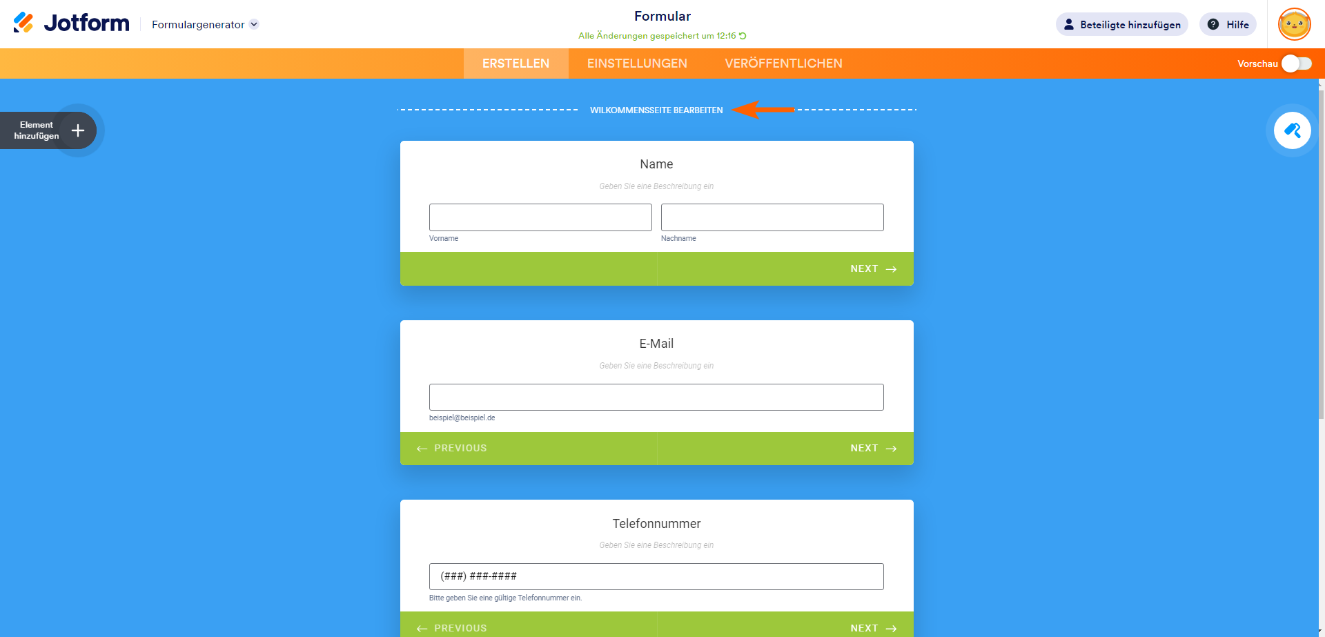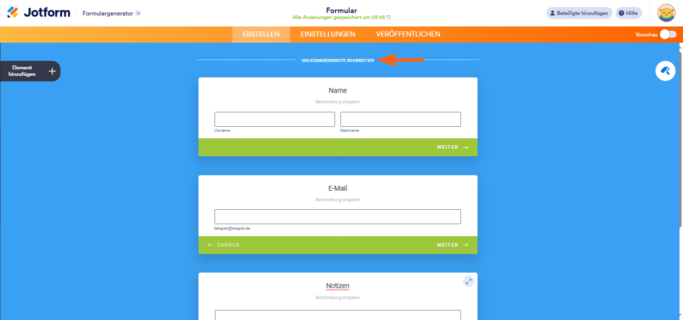 - Wählen Sie im Formular-Generator oben Willkommensseite hinzufügen/bearbeiten aus.