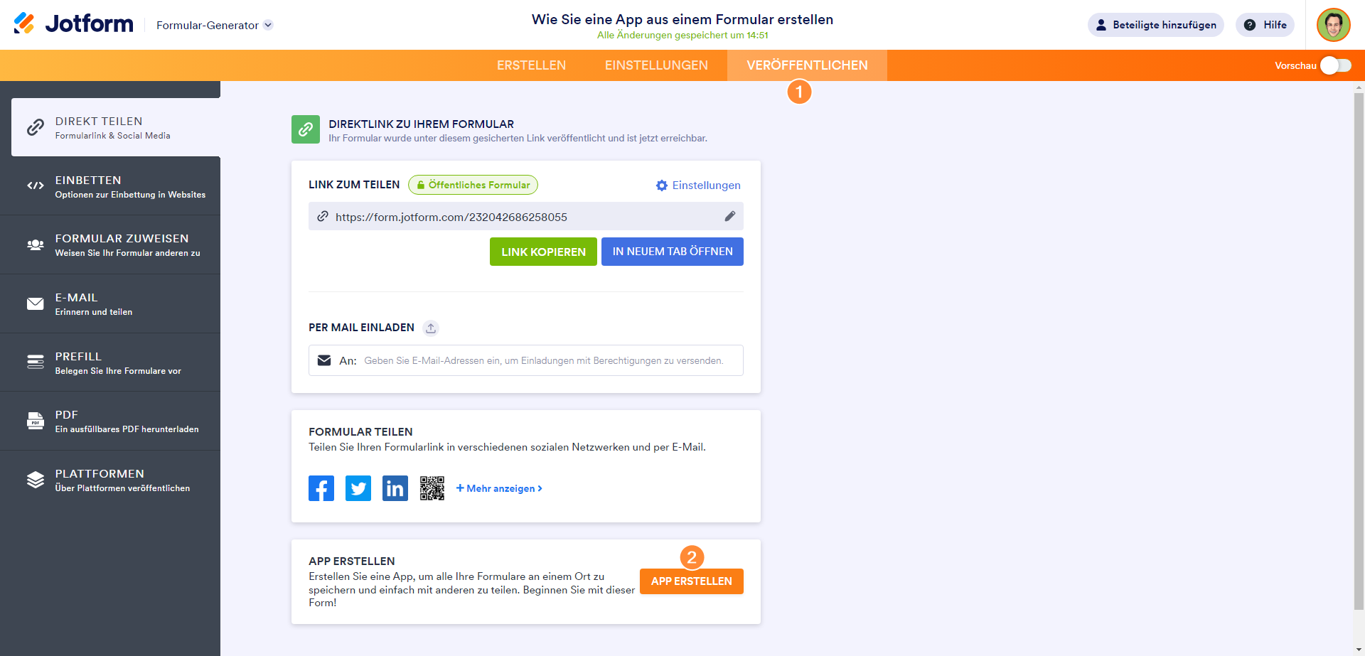 - Gehen Sie im Formular Generator oben auf Veröffentlichen.