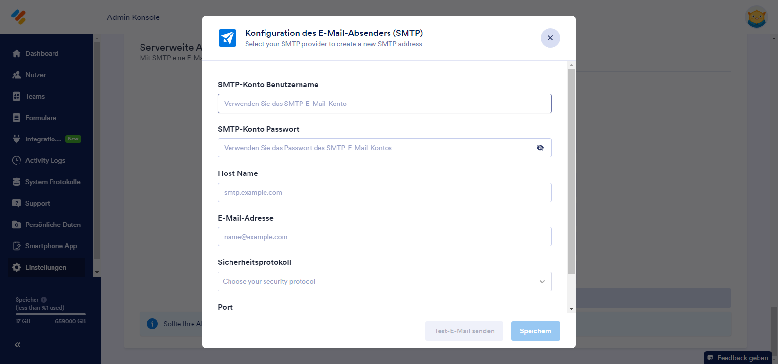 - Bieten Sie die SMTP Anmeldedaten wie folgt an: