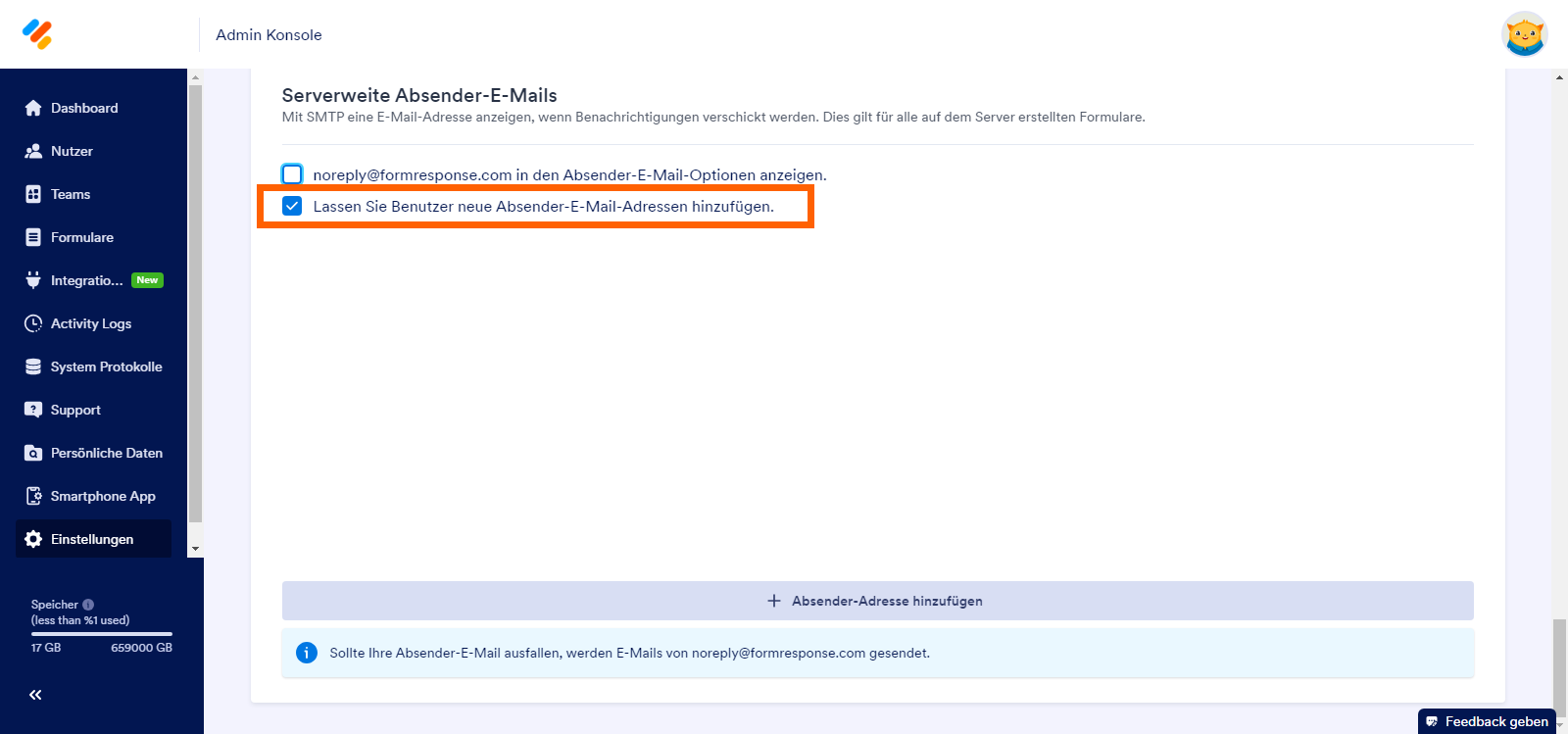 - Die ausgewählte benutzerdefinierte Absender-E-Mail wird zur Standard-E-Mail für alle neuen Formulare, die auf Ihrem Unternehmensserver erstellt werden.