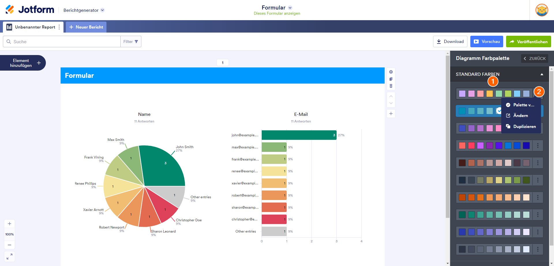 Die Farbpalette, die Sie in den Layout-Einstellungen des Berichtserstellers festlegen, wird automatisch auf jedes Diagramm in Ihrem Bericht angewendet, das keine spezifische Palette in seinen Einstellungen hat.