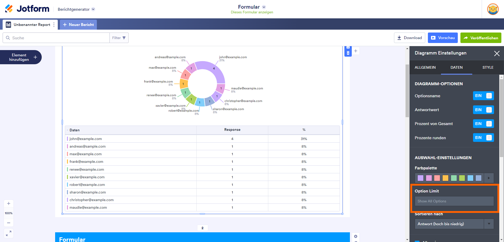 Standard sortiert die Optionen im Diagramm basierend auf der Reihenfolge, in der die Optionen im Formular erscheinen.