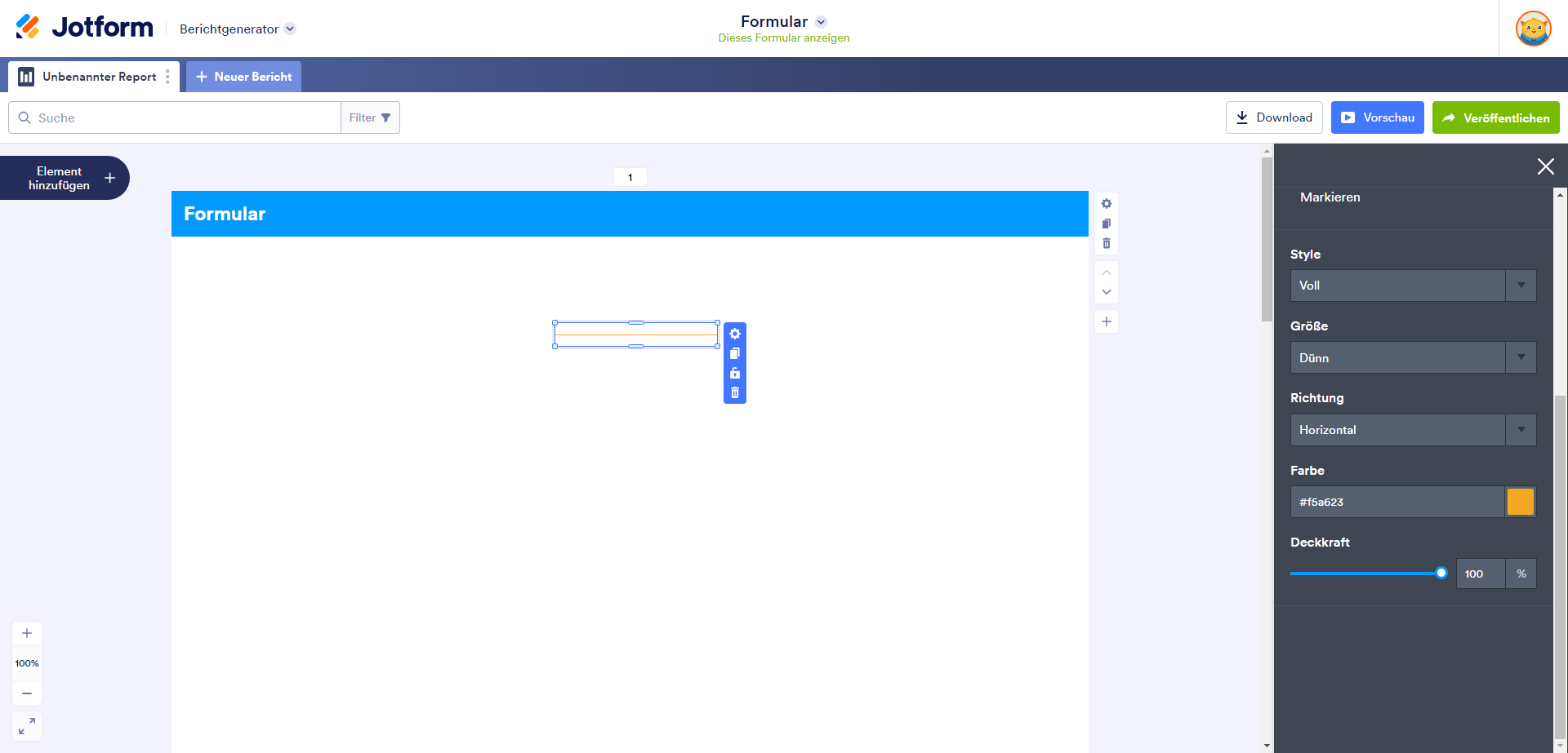Der Linientyp hingegen verfügt über eigene Einstellungen für Stil, Größe, Richtung, Farbe und Deckkraft. Der Linientyp kann als Trennlinie im Bericht verwendet werden.
