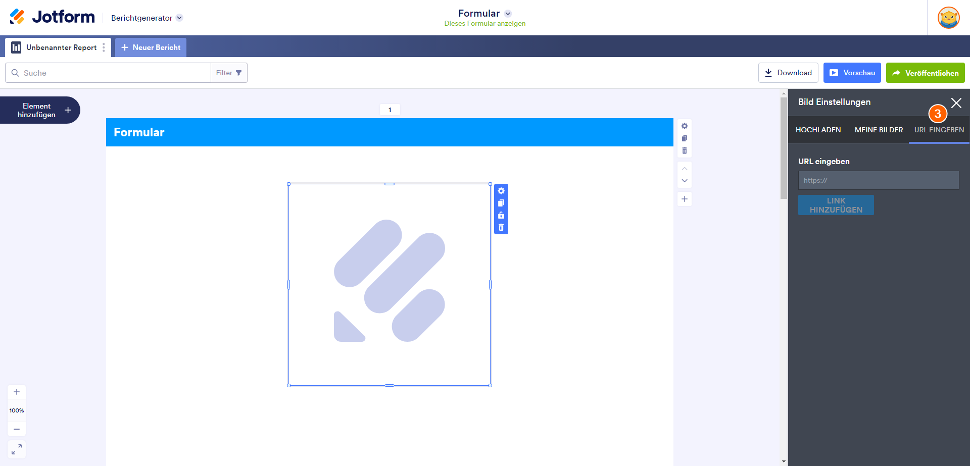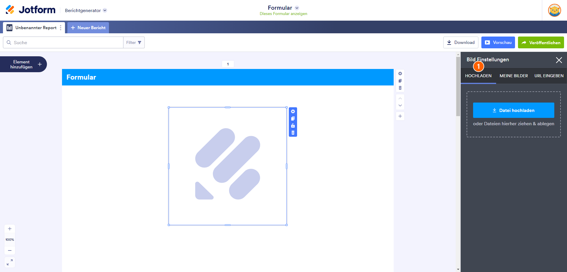 Bildeinstellungen: Der Jotform Berichtsgenerator ermöglicht es Ihnen, ganz einfach ein Unternehmenslogo zu Ihrem Bericht hinzuzufügen. Es gibt drei Möglichkeiten, ein Bild in Ihren Bericht einzufügen.