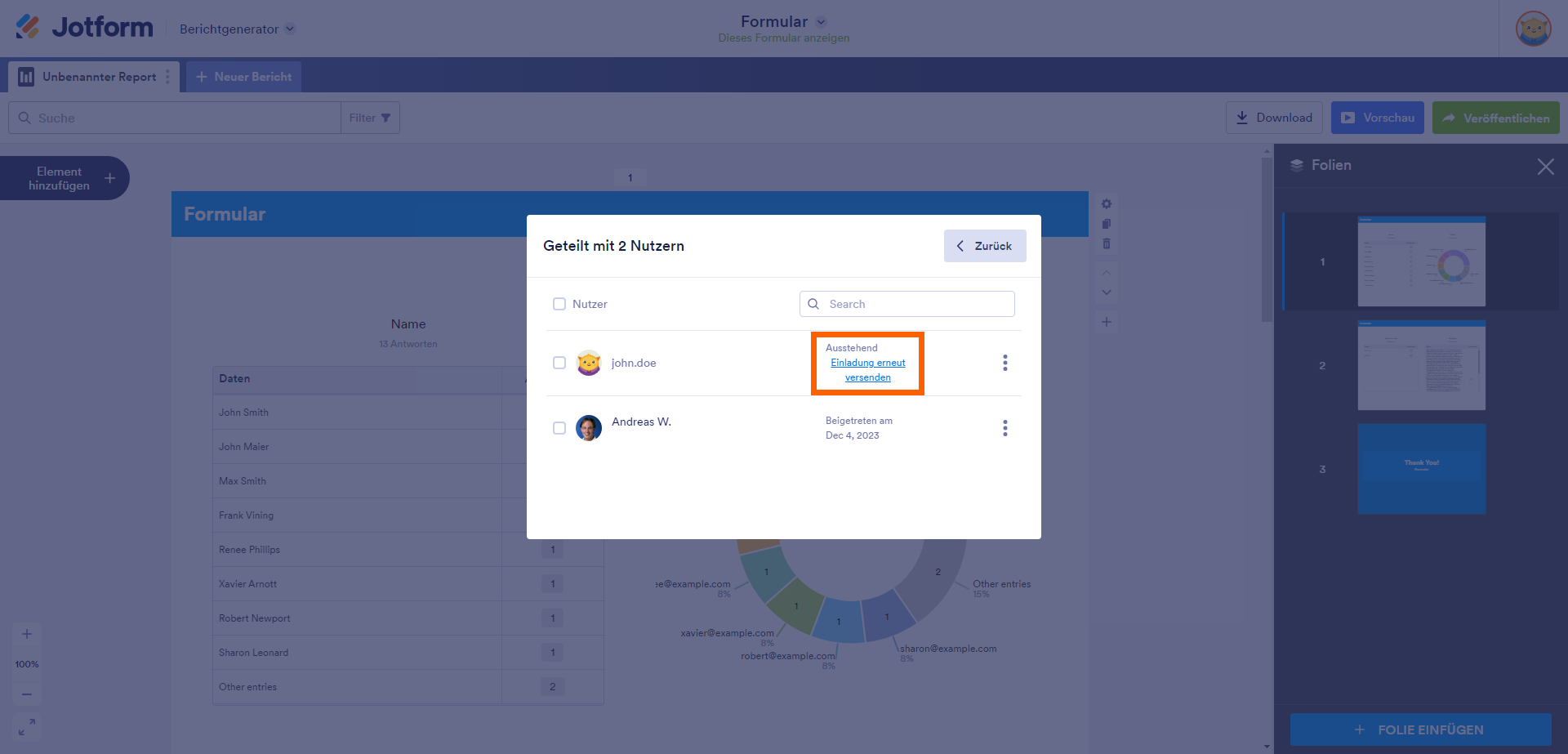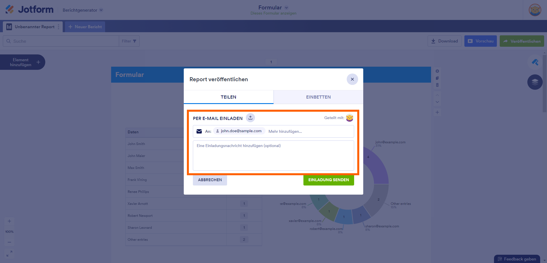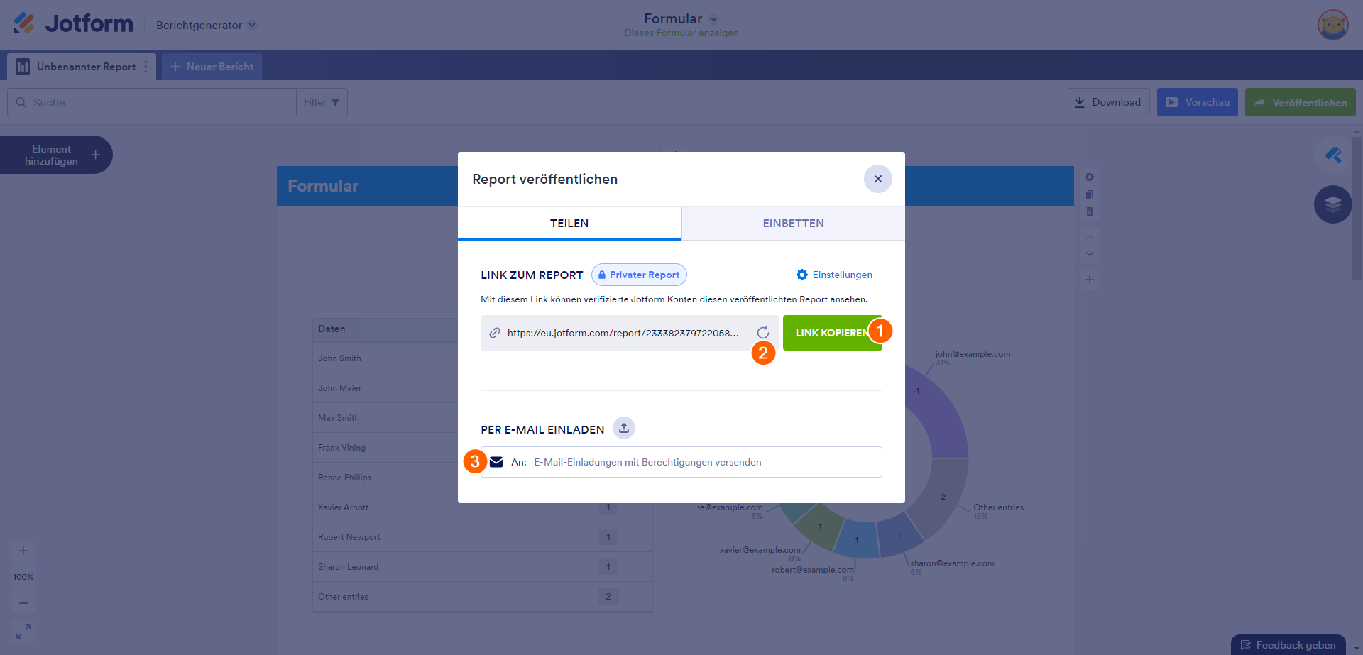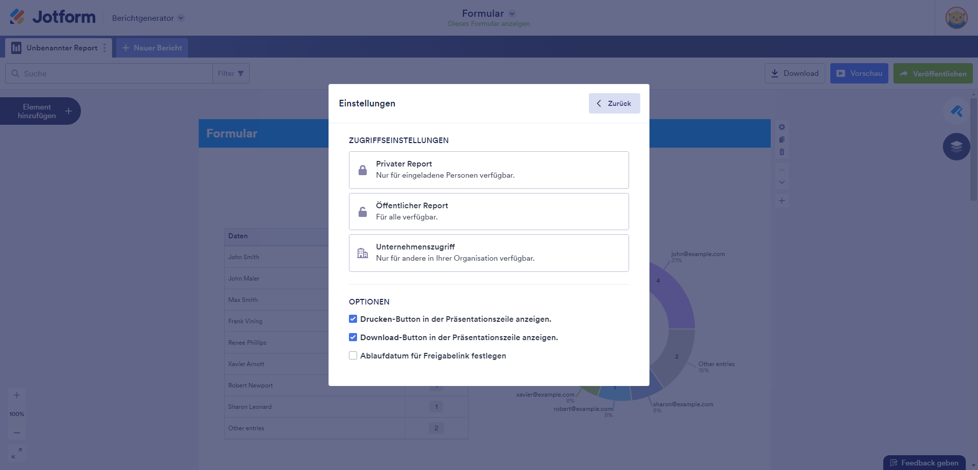Mit dem Jotform Visual Report Builder können Sie Formulareingaben ohne Programmierung in visuelle Berichte umwandeln und diese ganz einfach teilen: Versenden Sie einen Link, betten Sie die Berichte in Webseiten ein oder laden Sie sie herunter und drucken Sie sie für Meetings aus. Informationen zum Erstellen visueller Berichte finden Sie unter So erstellen Sie einen visuellen Bericht.