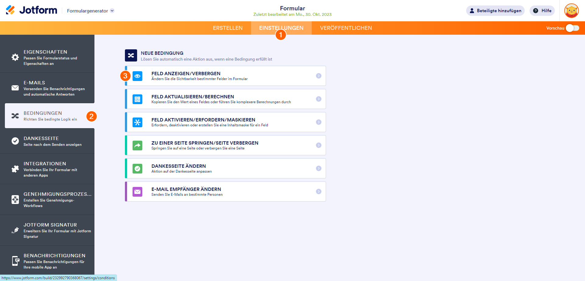 Der wichtigste Teil der Bedingung ist, dass Sie die URL der Formularseite als Quellfeld, Enthält als Status und das Wort Bearbeiten als Zielwert auswählen.