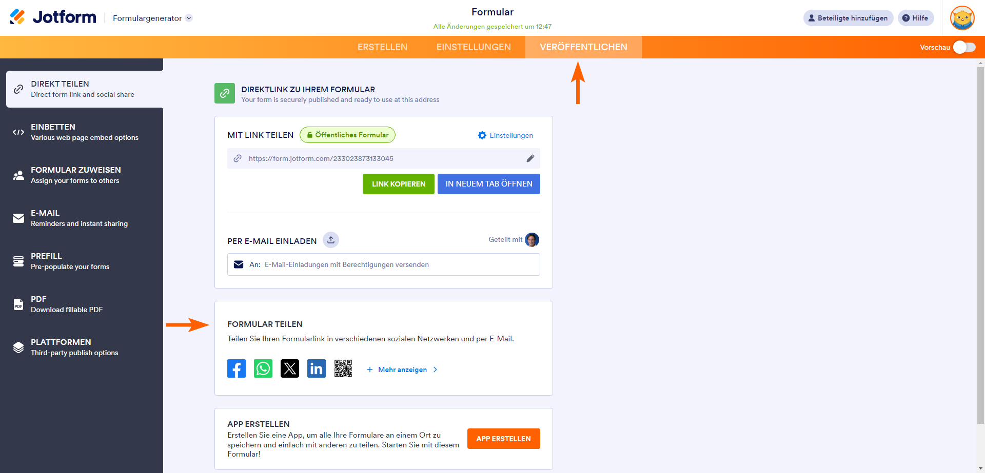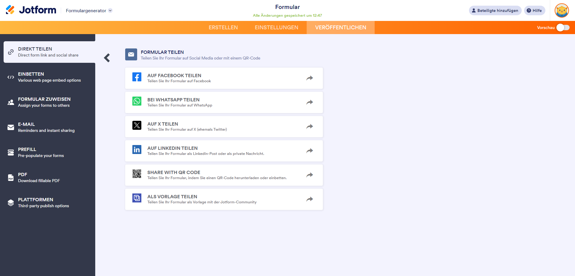 - Gehen Sie im Formular-Generator auf die Registerkarte Veröffentlichen. Sie sehen dann automatisch die Seite Quick Share.
