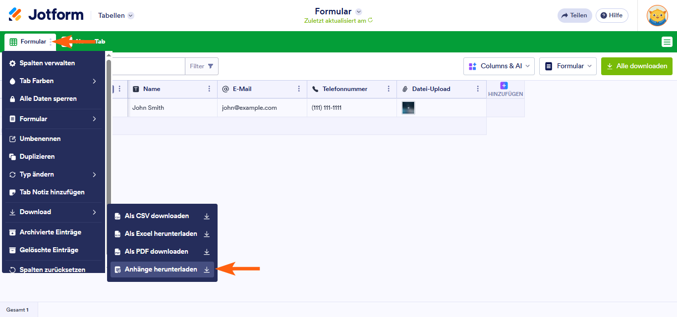 - Klicken Sie in Jotform Tabellen rechts auf der Seite auf die Schaltfläche Alle herunterladen, um die Download-Optionen zu öffnen.