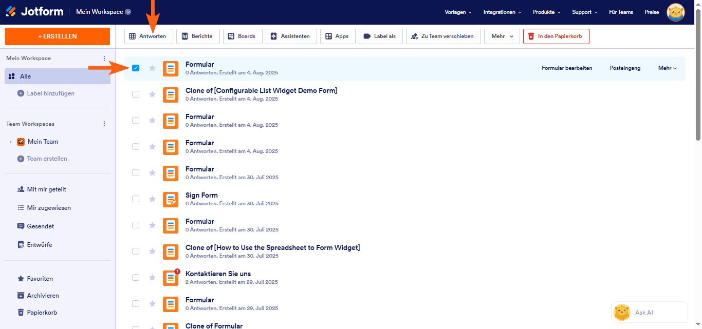 - Klicken Sie auf der Seite Meine Formulare auf Ihr Formular, um es auszuwählen.