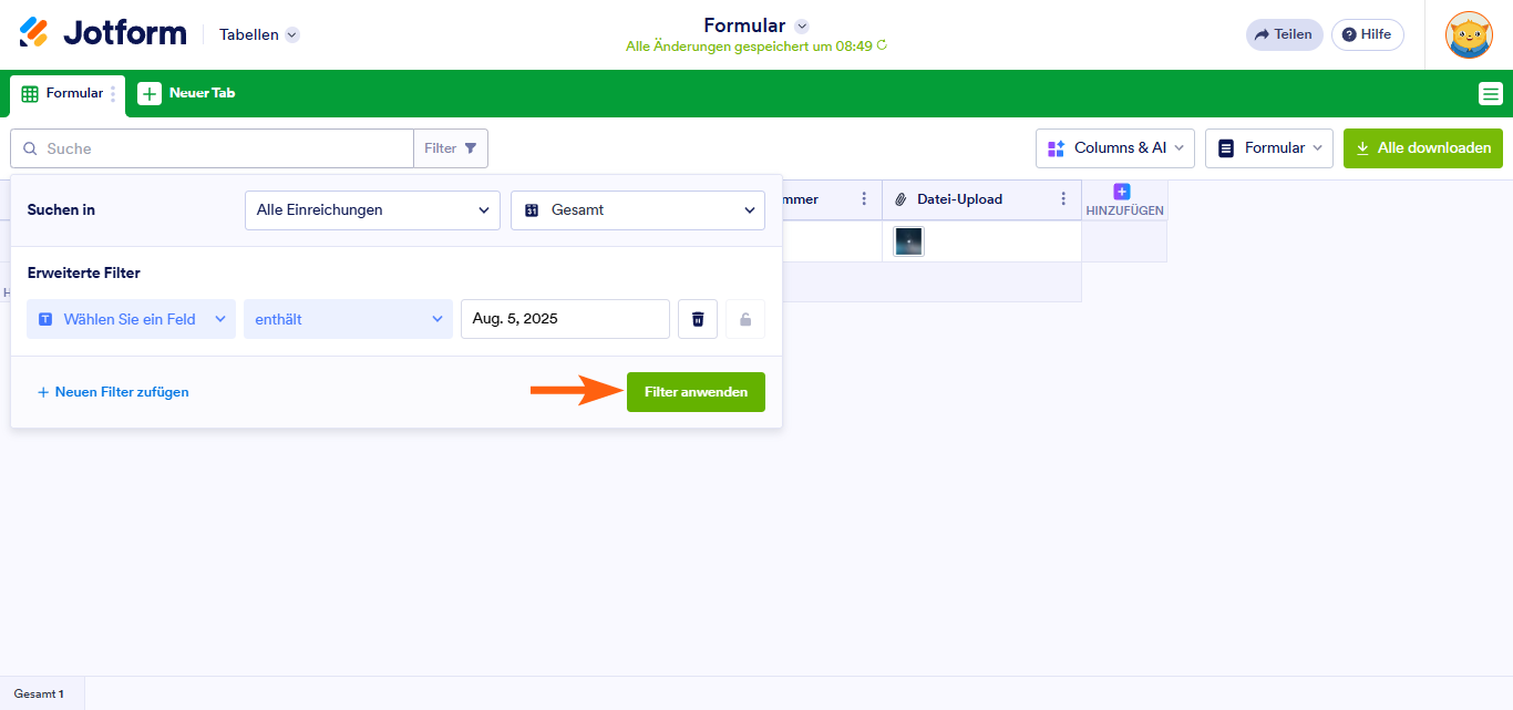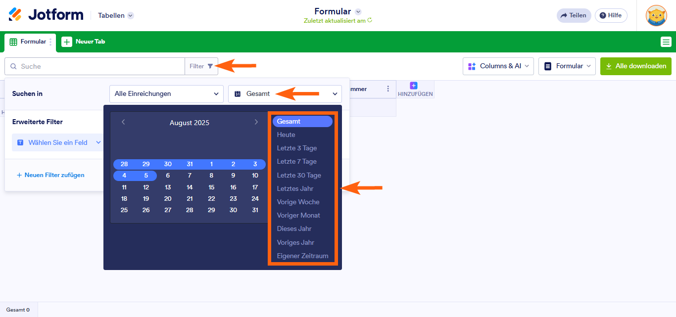 Das Herunterladen von Dateien basierend auf einem Zeitbereich erfolgt durch Filtern über Jotform Tabellen. So geht’s: