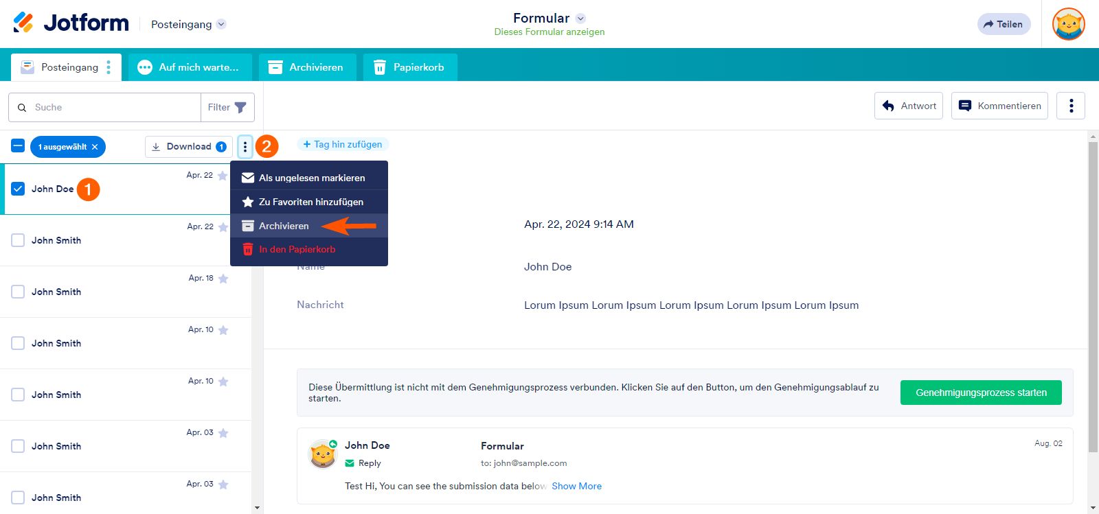 - Wählen Sie im Jotform-Posteingang die Formularantworten aus, die Sie archivieren möchten.