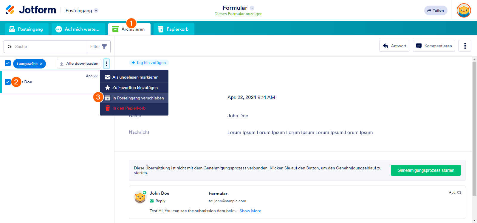 So können Sie die Archivierung aufheben oder die Formularantworten zurück in den Posteingang verschieben: