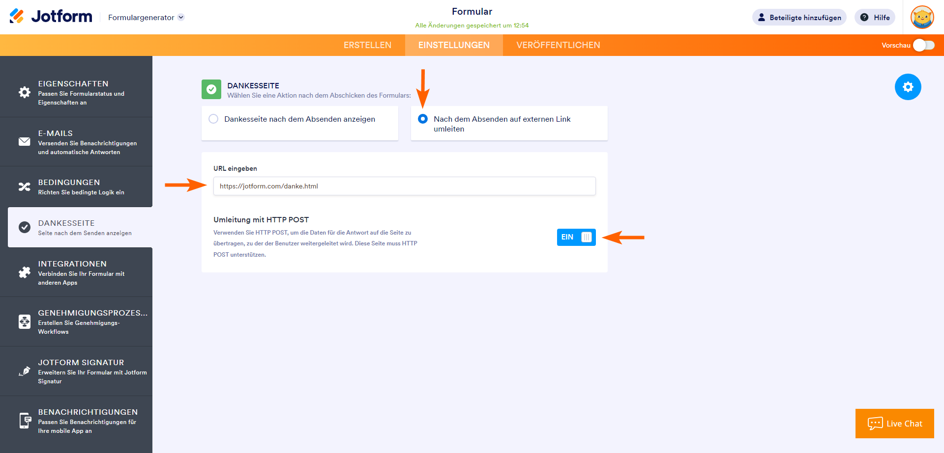 - Schalten Sie anschließend die Einstellung Weiterleitung mit HTTP POST auf die Position Ein.