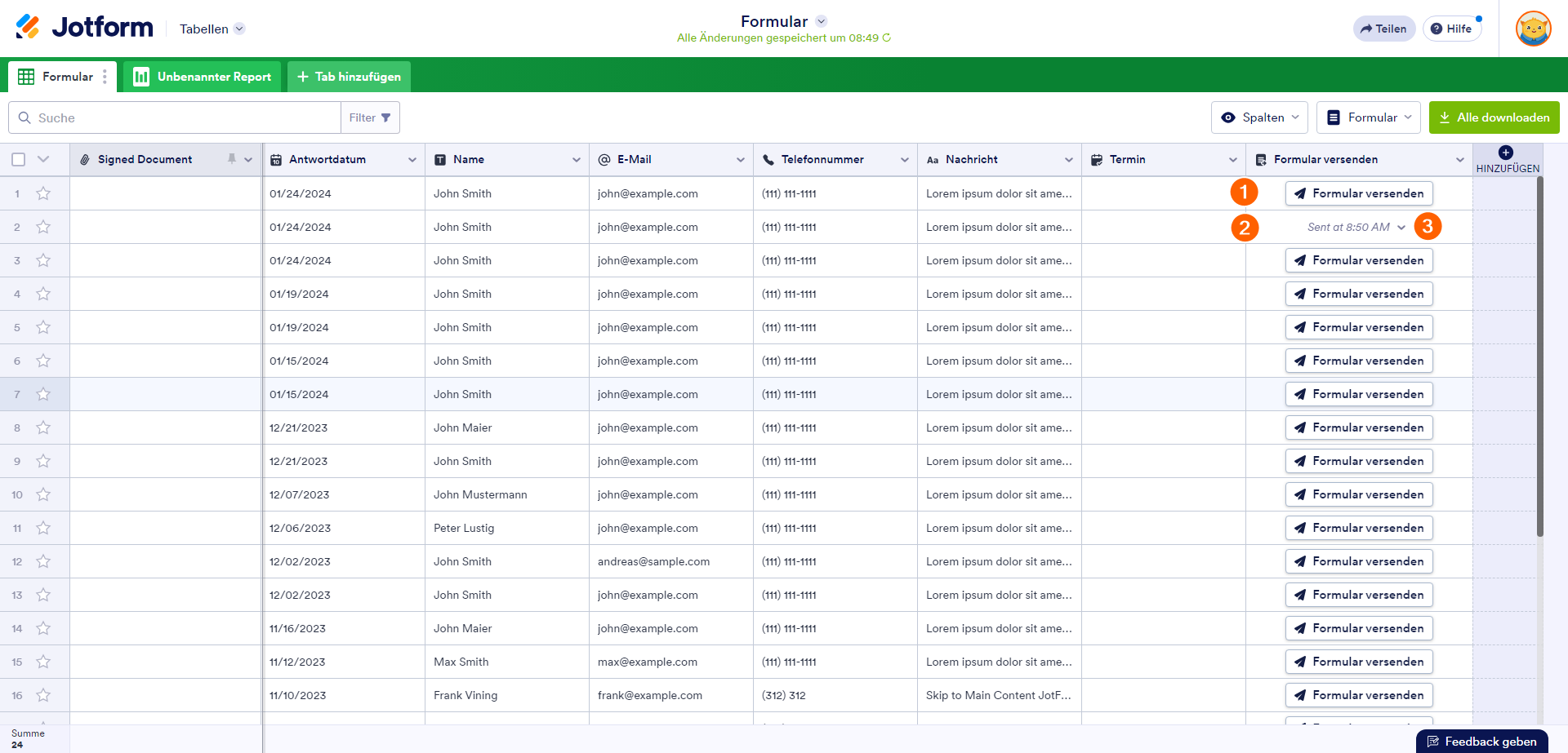 Mit den Funktionen der neuen Action Buttons können Sie Ihren Formularbenutzern direkt aus den Jotform Tabellen verschiedene Formulare zur Nachverfolgung oder weiteren Kontaktaufnahme zusenden.