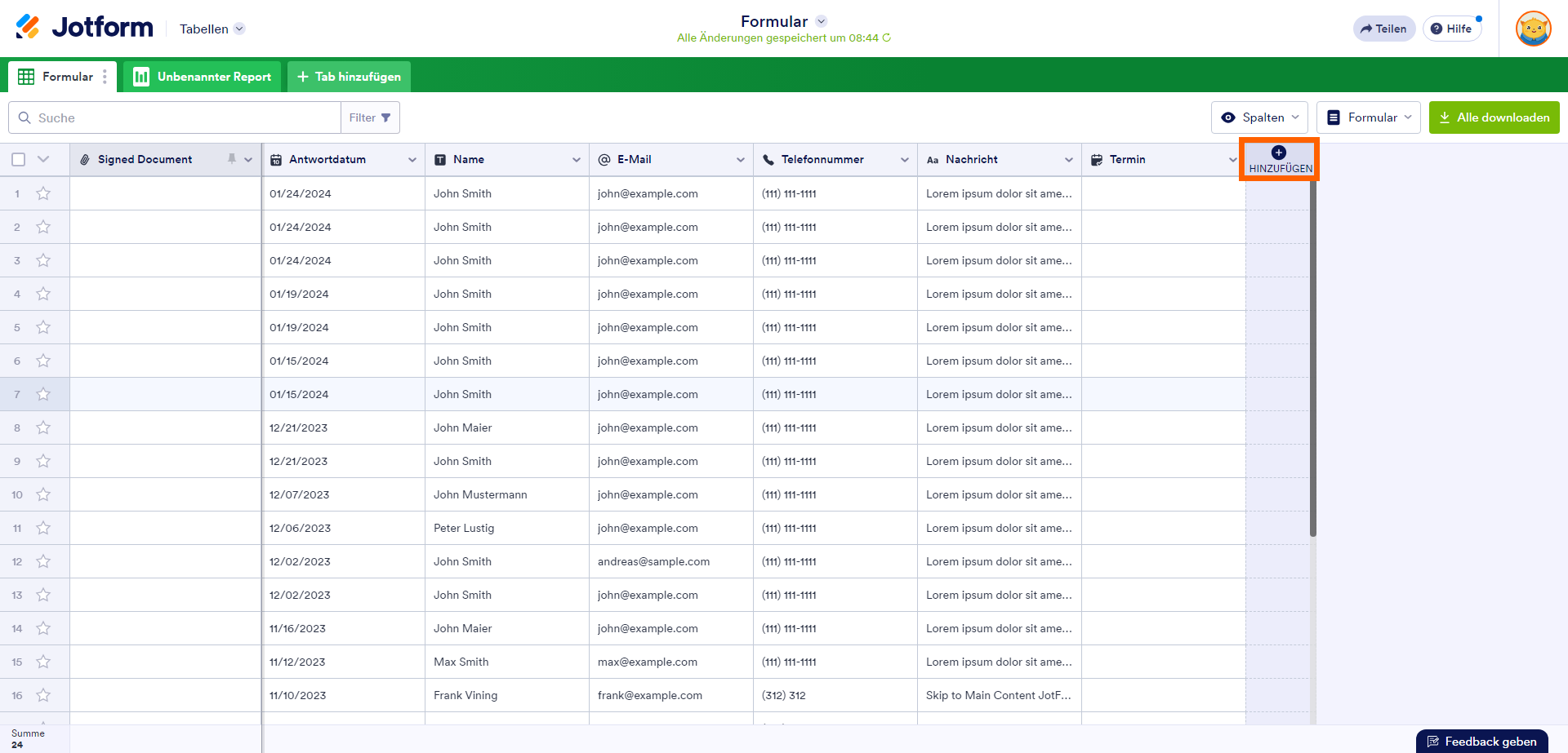 Zuallererst öffnen Sie Ihre Jotform-Tabelle, aus der Sie zusätzliche Formulare versenden möchten, scrollen Sie bis zum rechten Rand Ihrer Tabelle und klicken Sie auf den Button +Hinzufügen: