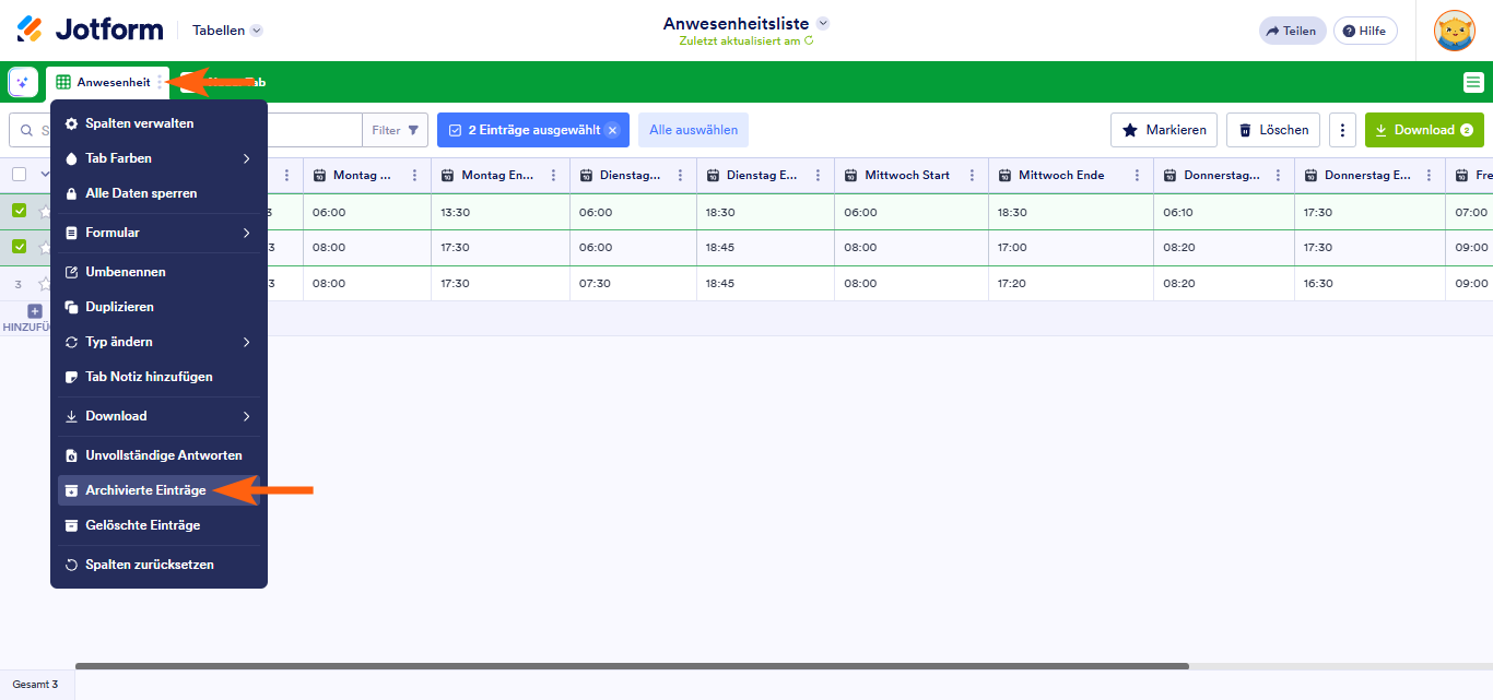 - In Jotform Tabellen aktivieren Sie links die Kontrollkästchen der Einträge, die Sie archivieren möchten.