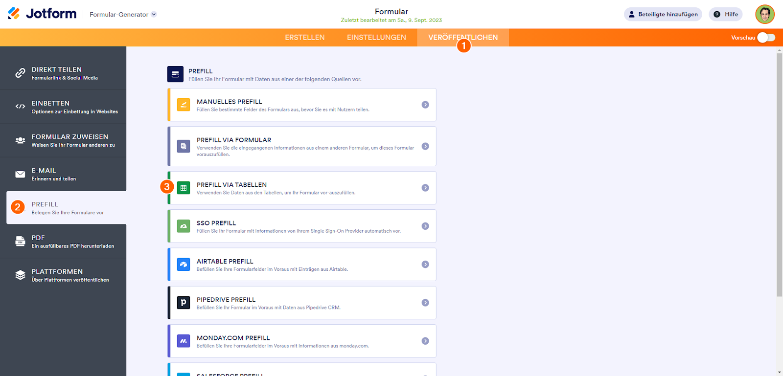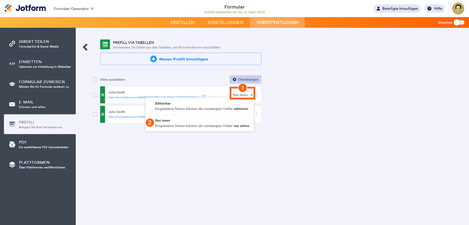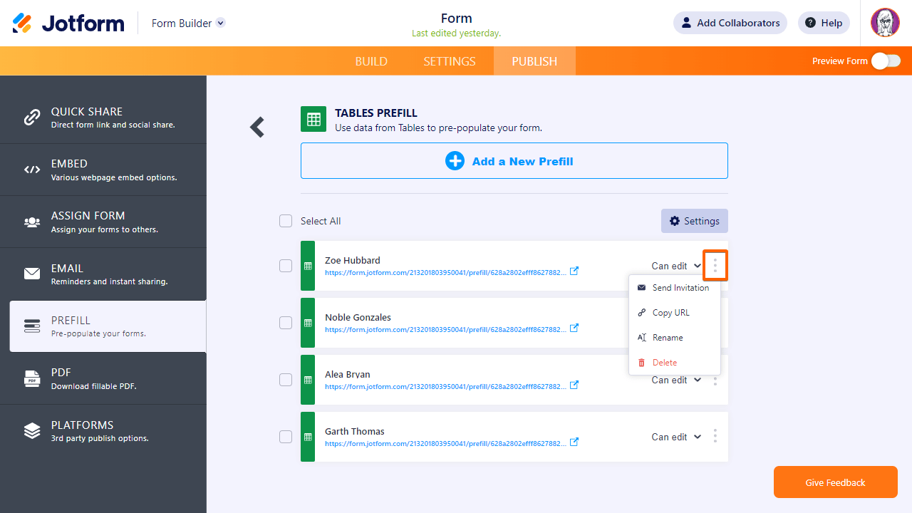 Sie können Ihre vorab ausgefüllten URLs jetzt kopieren und teilen. Nutzen Sie das Menü Prefill, um Ihre mit Prefill ausgefüllten URLs zu verwalten.