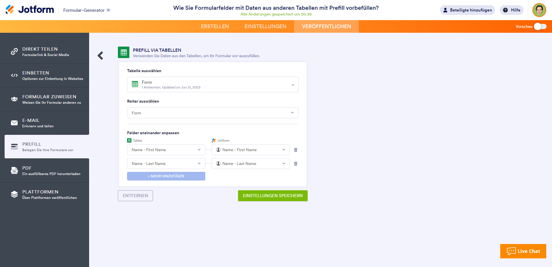 - Ordnen Sie die Spalten Ihrer Tabelle Ihren Formularfeldern zu und wählen Sie anschließend Einstellungen speichern.
