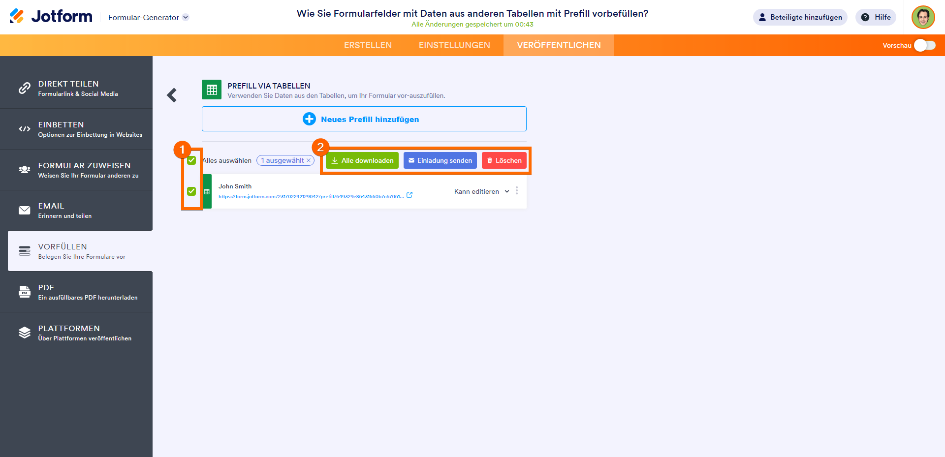 Sie können mehrere Vorbefüllungen auswählen, um sie alle gleichzeitig herunterzuladen, zu senden oder zu löschen.