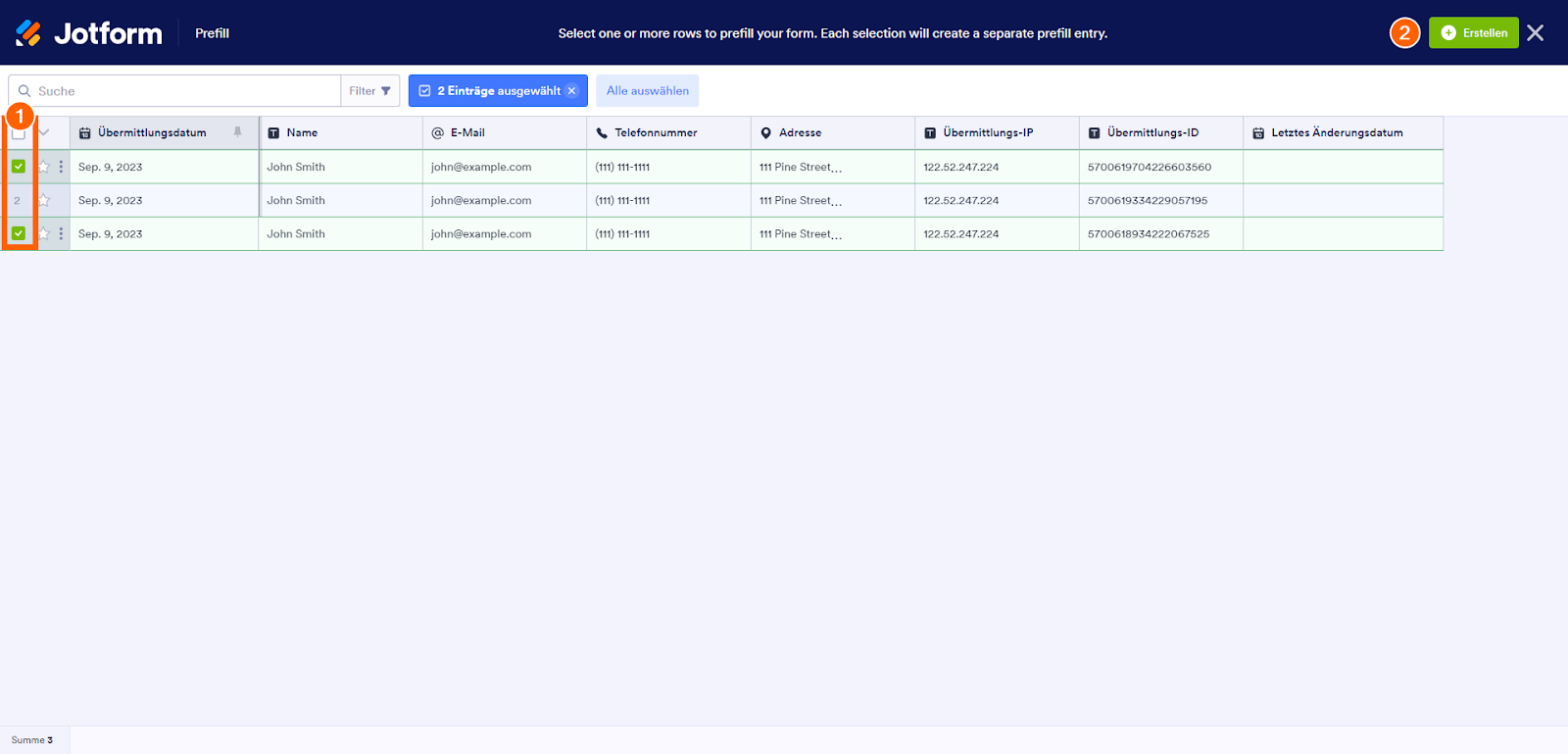 - Wählen Sie die Einträge aus, die Sie im Formular vorausfüllen möchten, und klicken Sie dann oben rechts auf Erstellen.