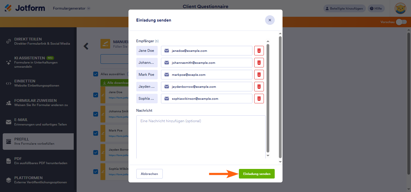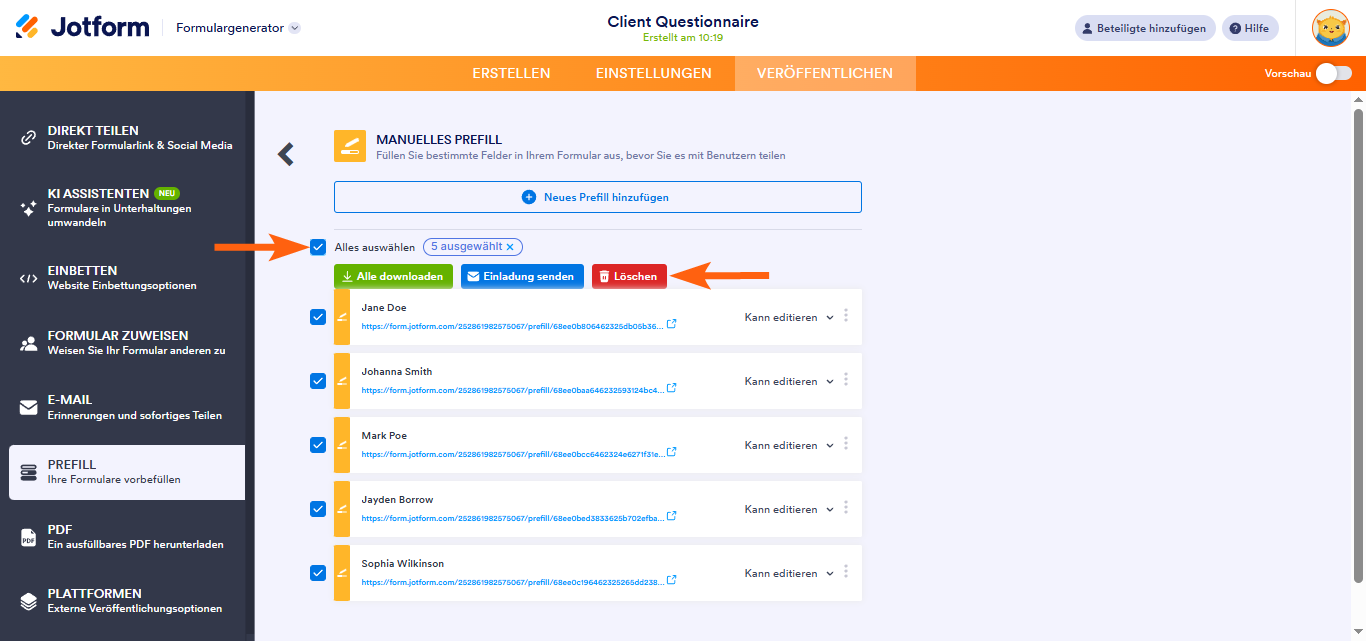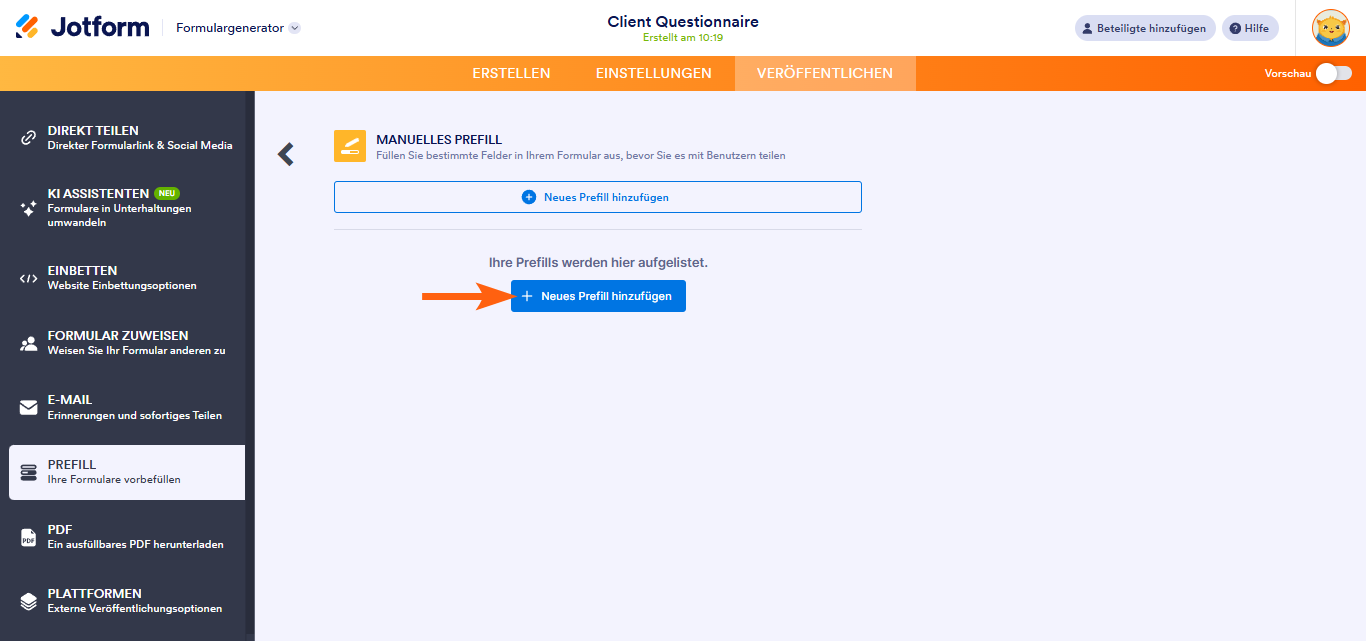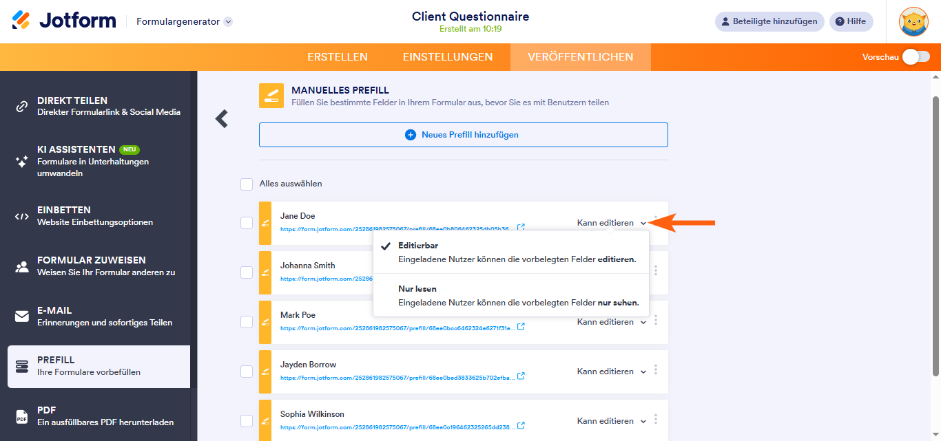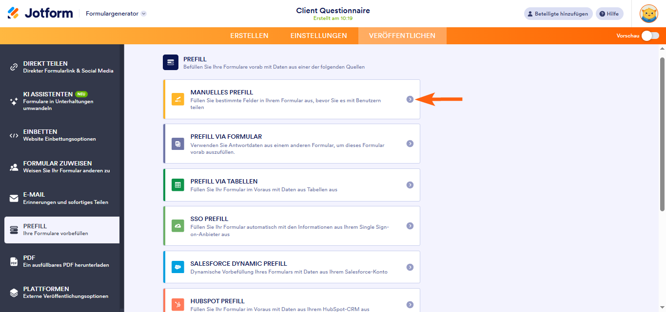 Wenn Sie wissen möchten, welche weiteren Möglichkeiten die Vorbefüllung bietet, empfehlen wir Ihnen Folgendes: Seite: Formularfelder mit Jotform Prefill vorab ausfüllen.