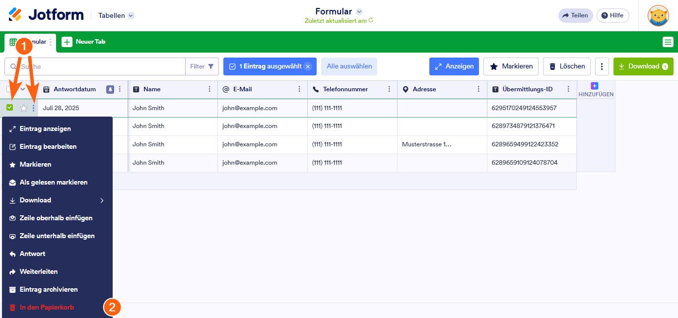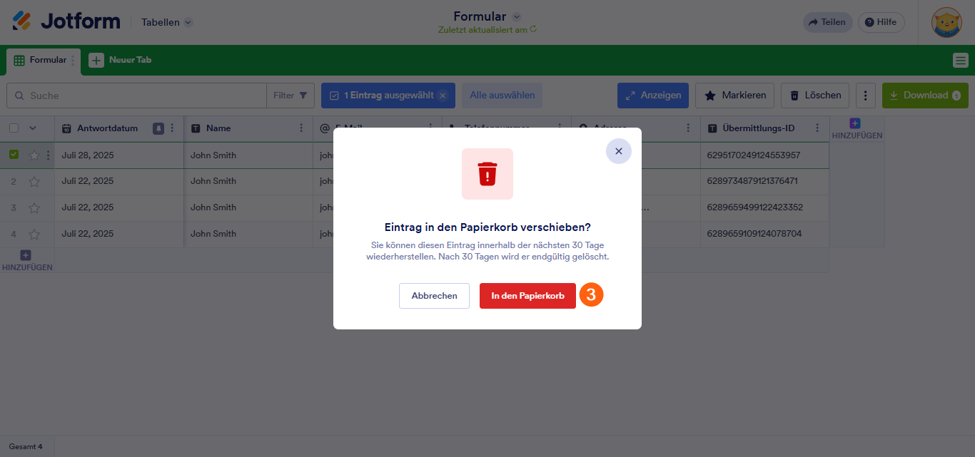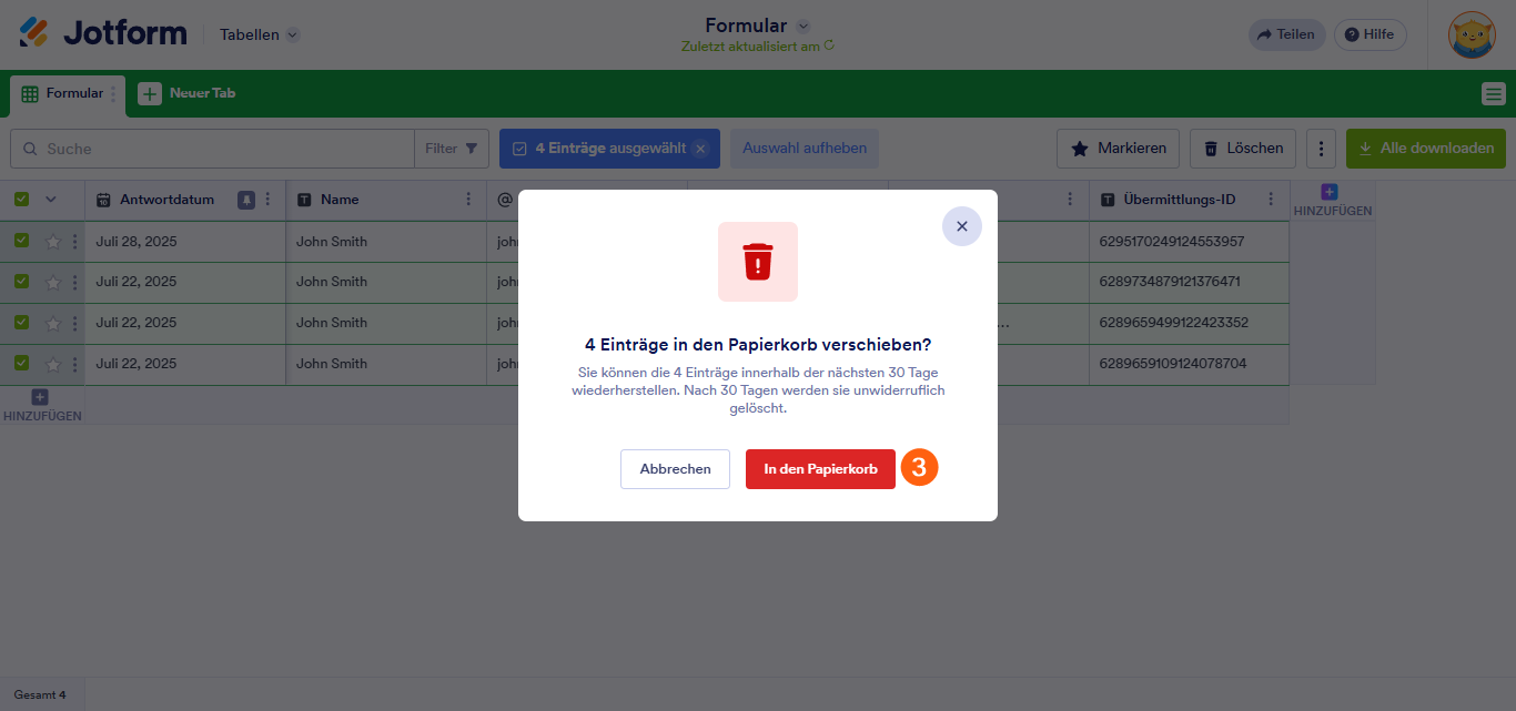 Mit Jotform können Sie Einreichungsdaten ganz einfach direkt aus Ihren Einreichungstabellen löschen. Nach dem Herunterladen Ihrer Einreichungen möchten Sie möglicherweise alte oder Testeinträge entfernen und nur die aktuellen behalten. Ob Sie veraltete Antworten verwalten, Testeinträge löschen oder Datenschutzbestimmungen einhalten möchten – es ist wichtig zu wissen, wie Sie Einsendungen sicher löschen.