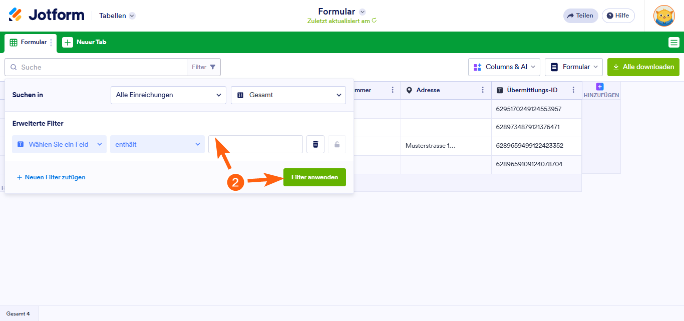- Klicken Sie in Ihrer Jotform Einsendungstabelle rechts neben der Suchleiste auf Filter.