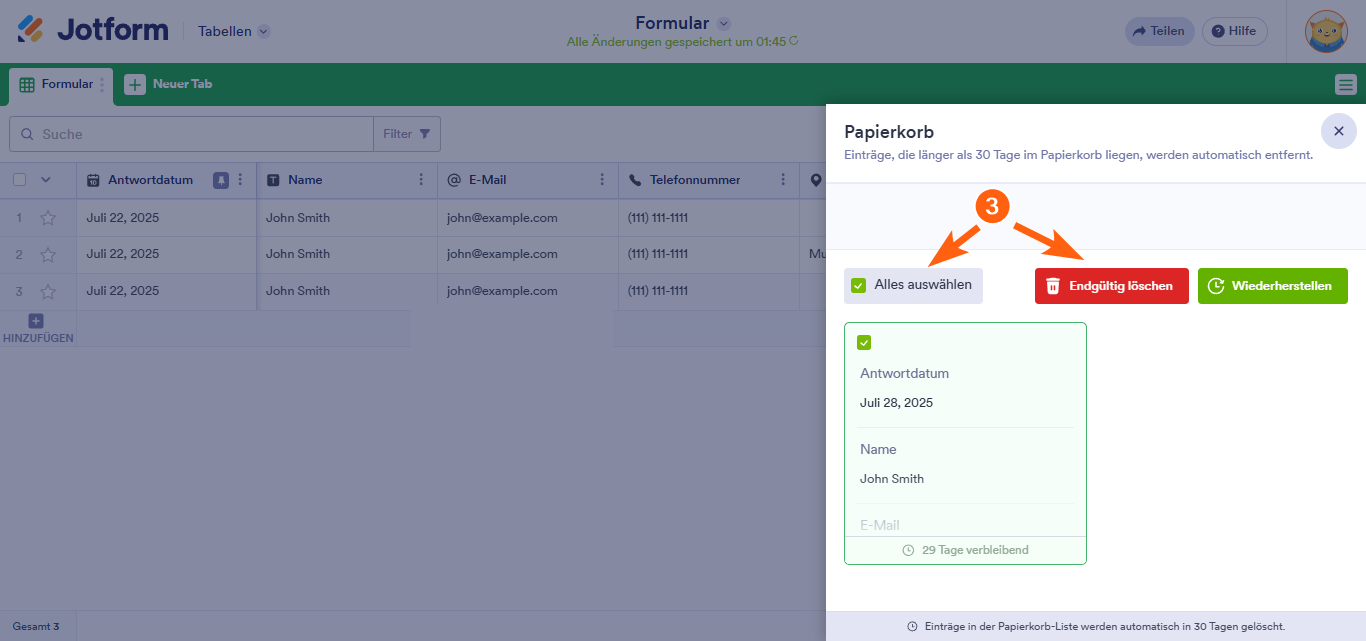 - Wenn Sie möchten, dass sich Einsendungen nach einer festgelegten Zeit selbst löschen, ist dies mit der automatischen Löschfunktion von Jotform ganz einfach. Richten Sie sie einfach einmal ein, und Ihr Formular erledigt dies für Sie. Weitere Informationen finden Sie in unserer Anleitung zum Automatischen Löschen von Formulareinreichungen.